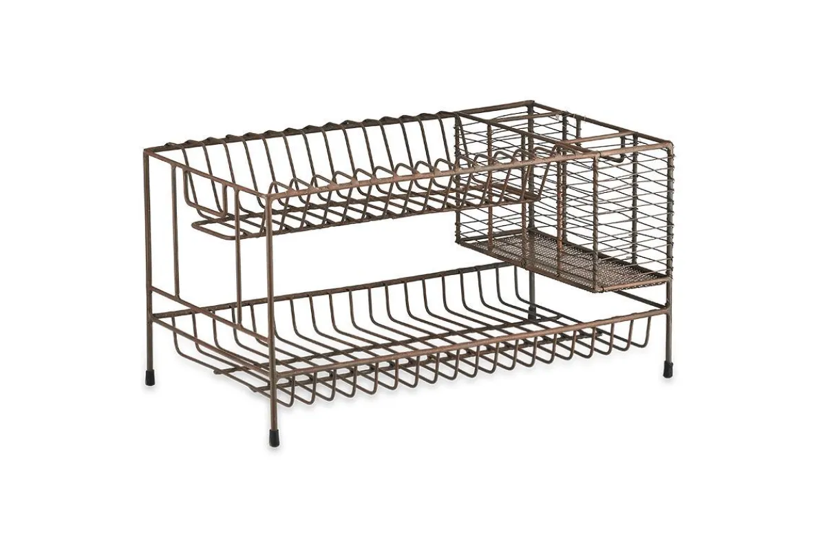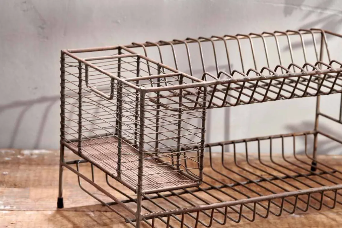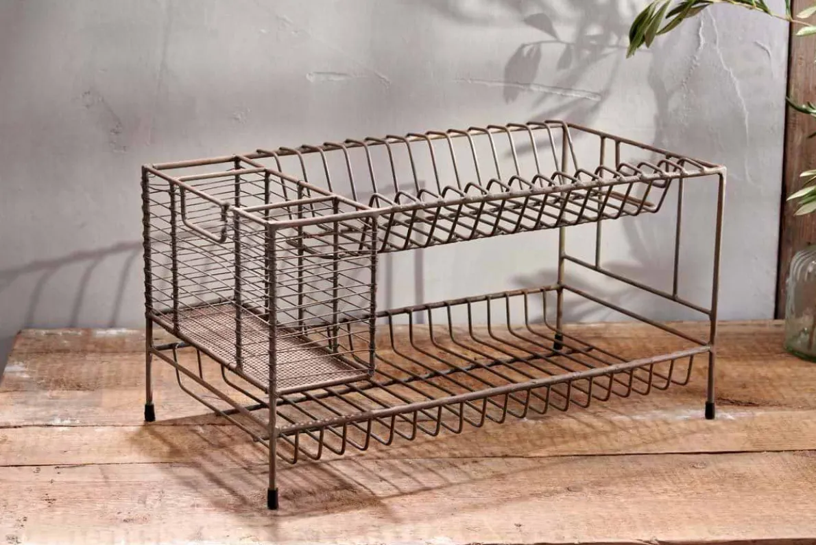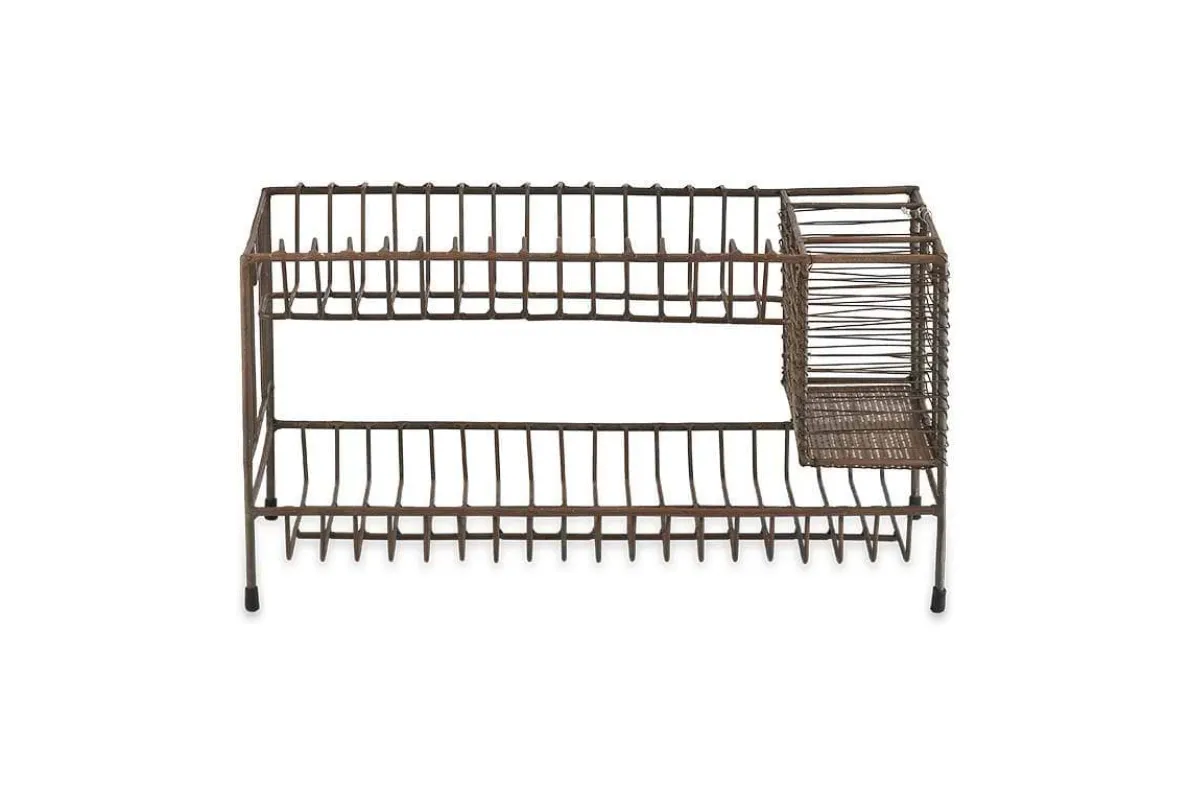 The utilitarian design of our Inkollu Dish Rack is given a touch of warmth with a subdued aged brass tone. This practical piece includes space for plates, bowls, and cutlery.