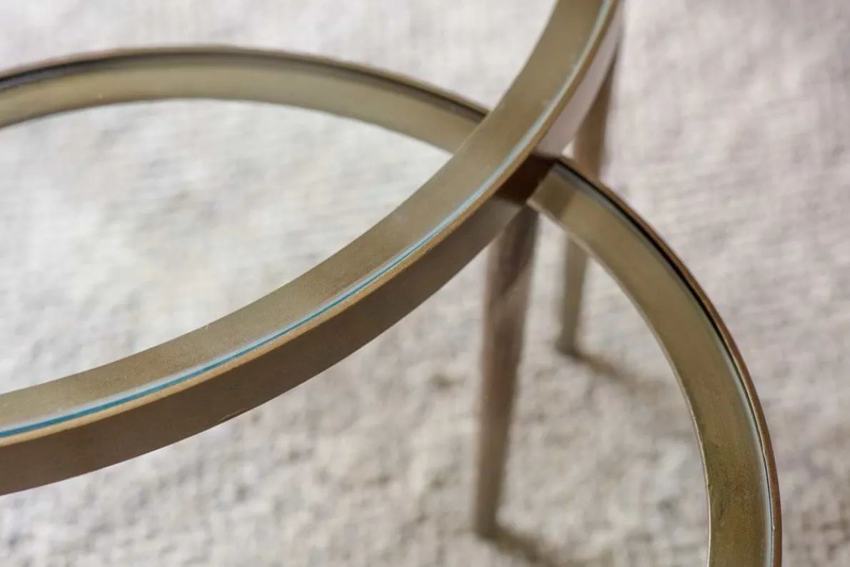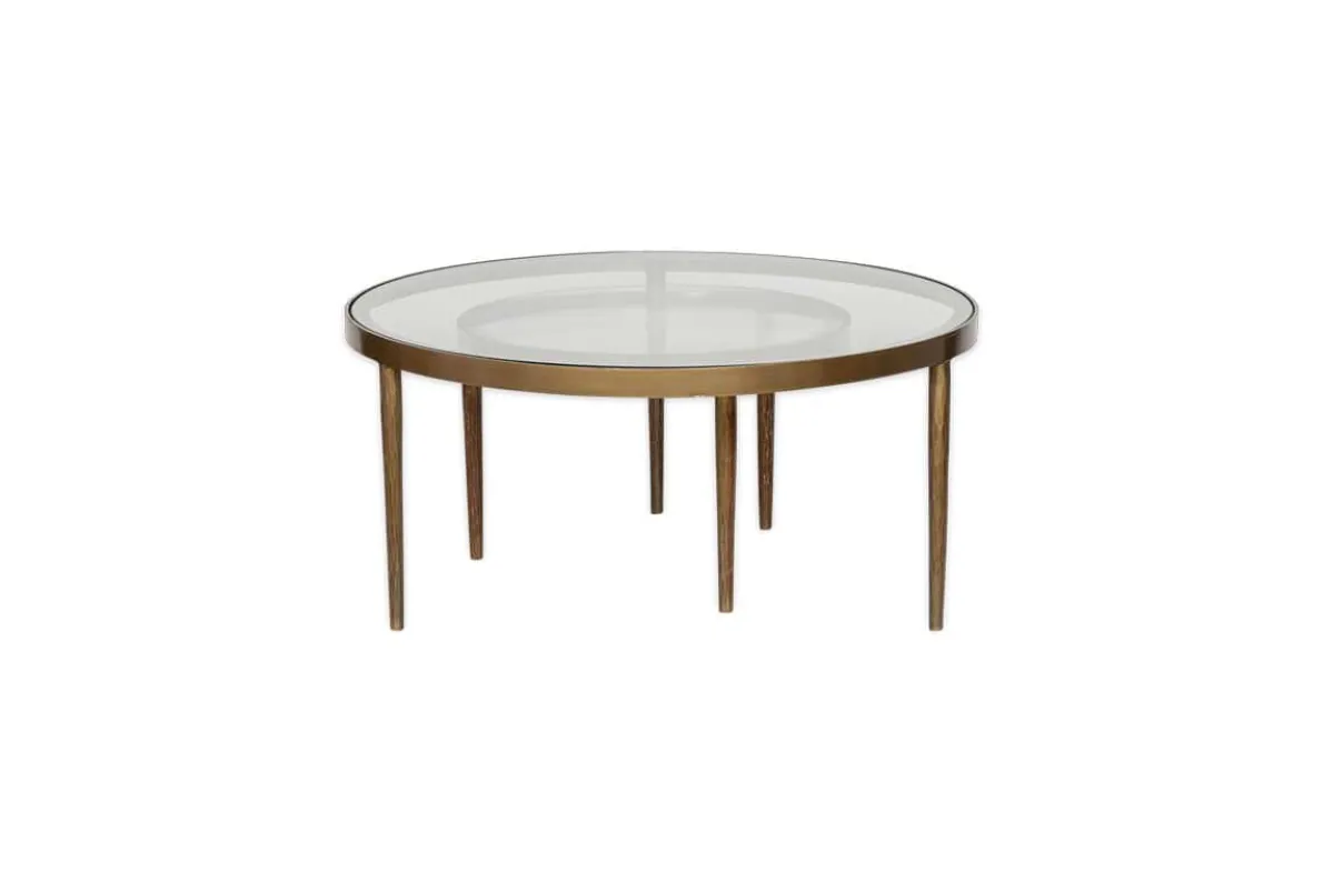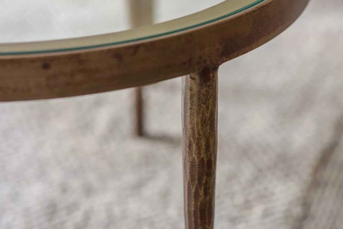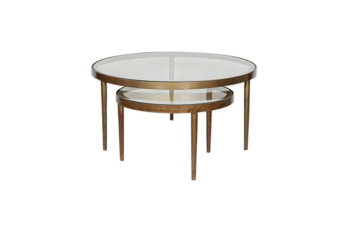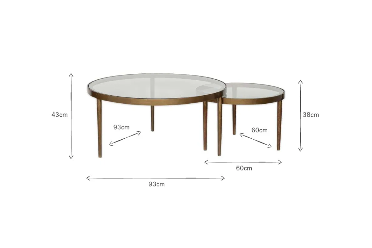 Our duo of Jiya coffee tables make an elegant addition to any living space, giving versatile extra table space when needed; the smaller table can then be neatly nested under the larger one when room is required. The smooth iron frames have an antique brass finish, securely holding the glass tops in place and the sleek legs have a textured look, creating two sophisticated pieces with timeless appeal.