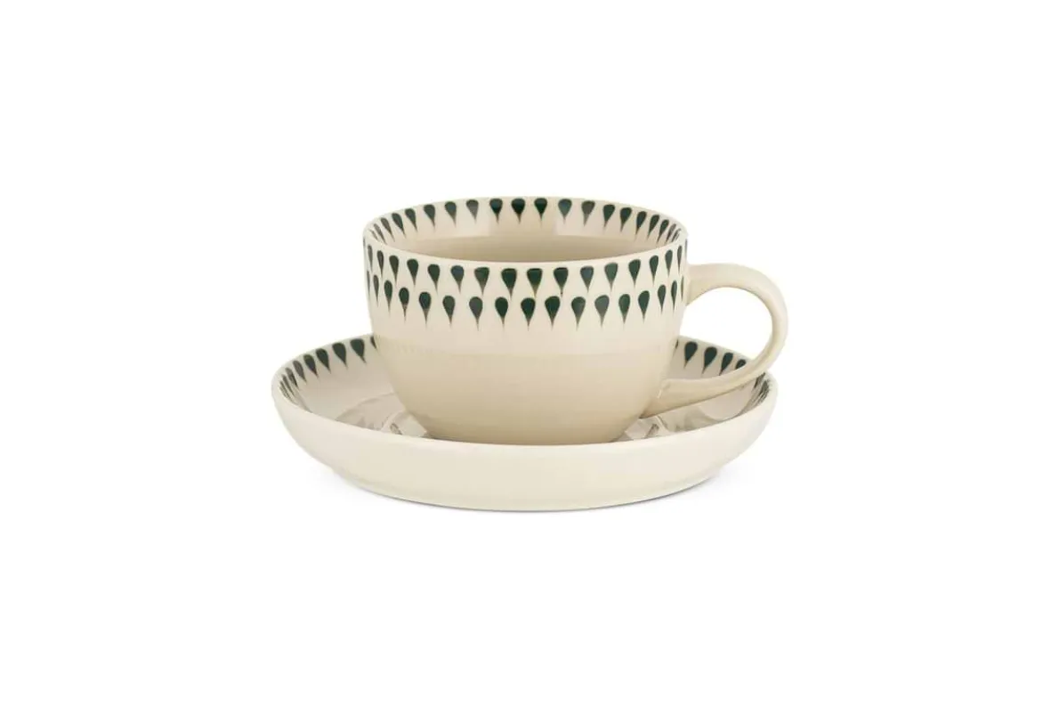 The Juniper Drop cup and saucer set brings a refined, natural touch to your tea or coffee ritual. Featuring a soft green drop design and smooth, rounded form, the cup rests neatly on its matching saucer. Pair with the coordinating Juniper Drop teapot for a thoughtful, cohesive set, perfect for slow mornings or relaxed afternoons.
