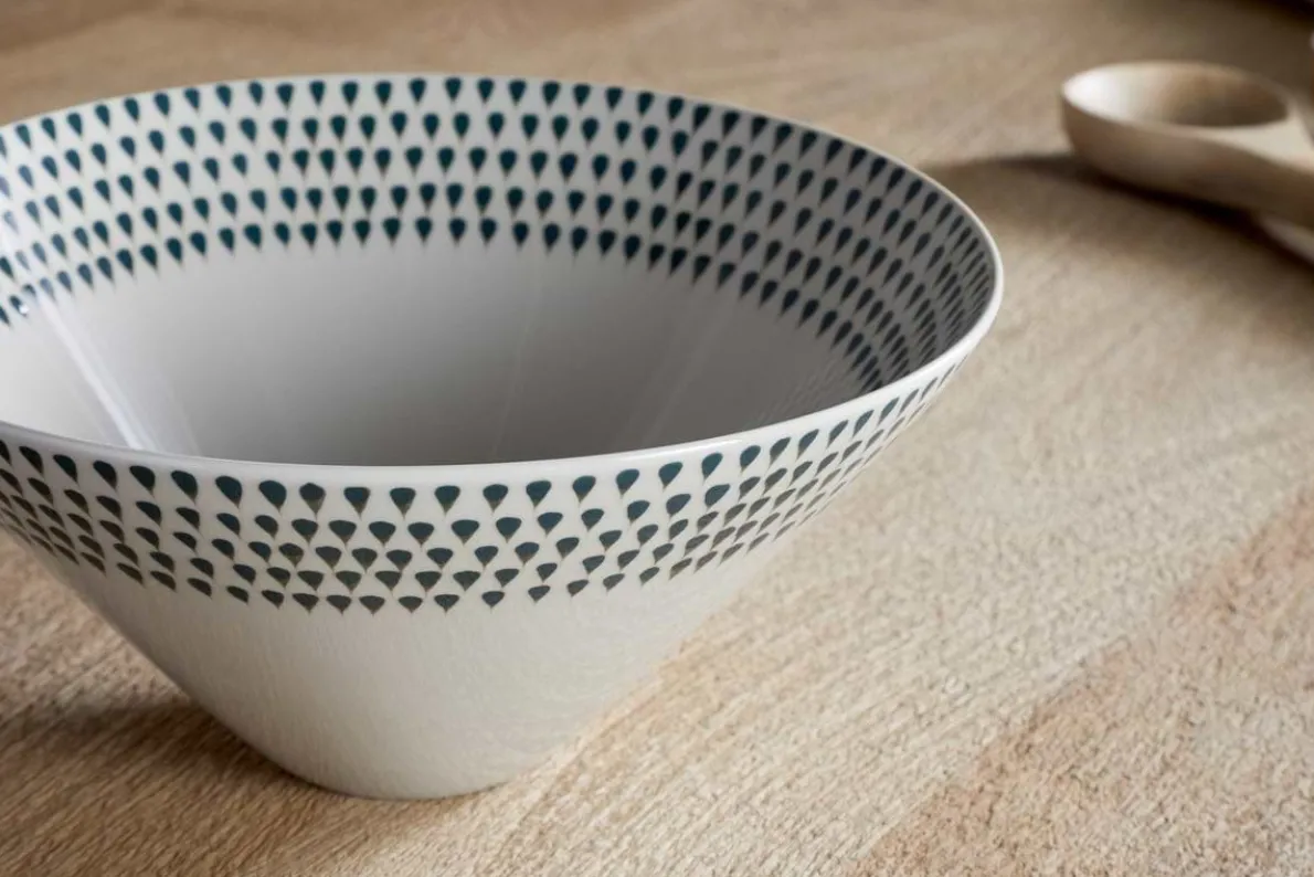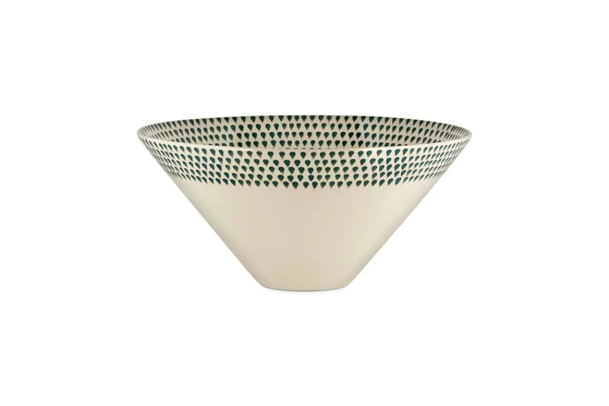 With its generous size and eye-catching drop design in deep juniper green, this serving bowl makes a beautiful centrepiece for shared dishes. The wide, angular shape is ideal for everything from vibrant salads to warming mains, while the bold pattern brings a sense of depth and texture to the table. A versatile and decorative addition to everyday dining or special gatherings.