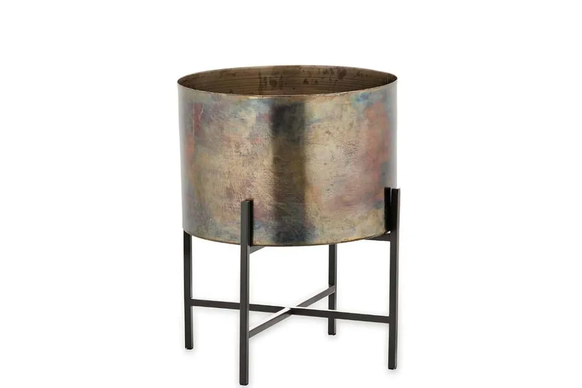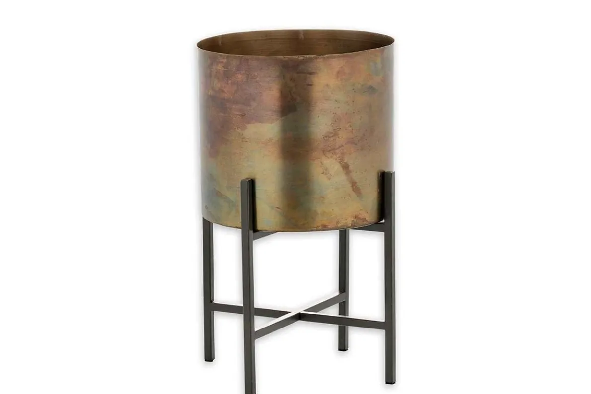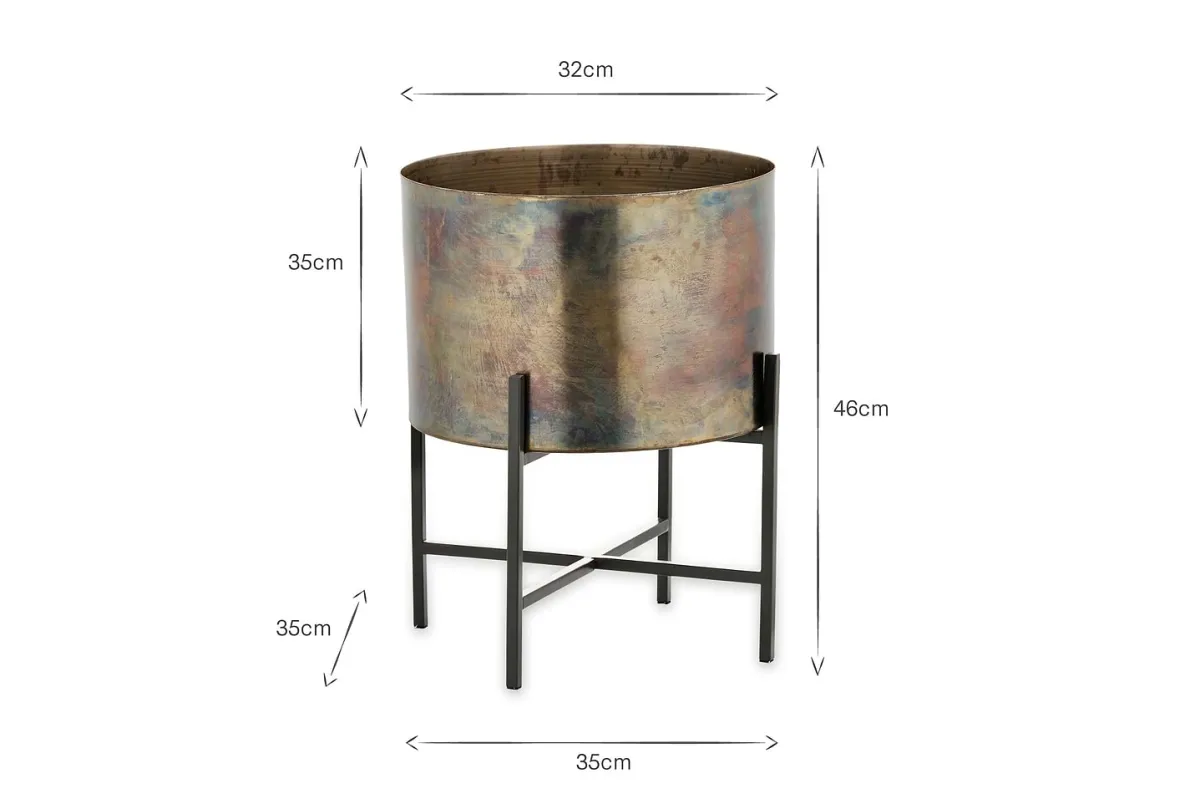 Contemporary in design, our Juoni iron planter has a stylish brass holder that sits neatly into a linear iron stand. The stand has a simple criss-cross base with a black finish. The contrast between its two materials adds to the sophisticated look and will complement the vivid greens of house plants.