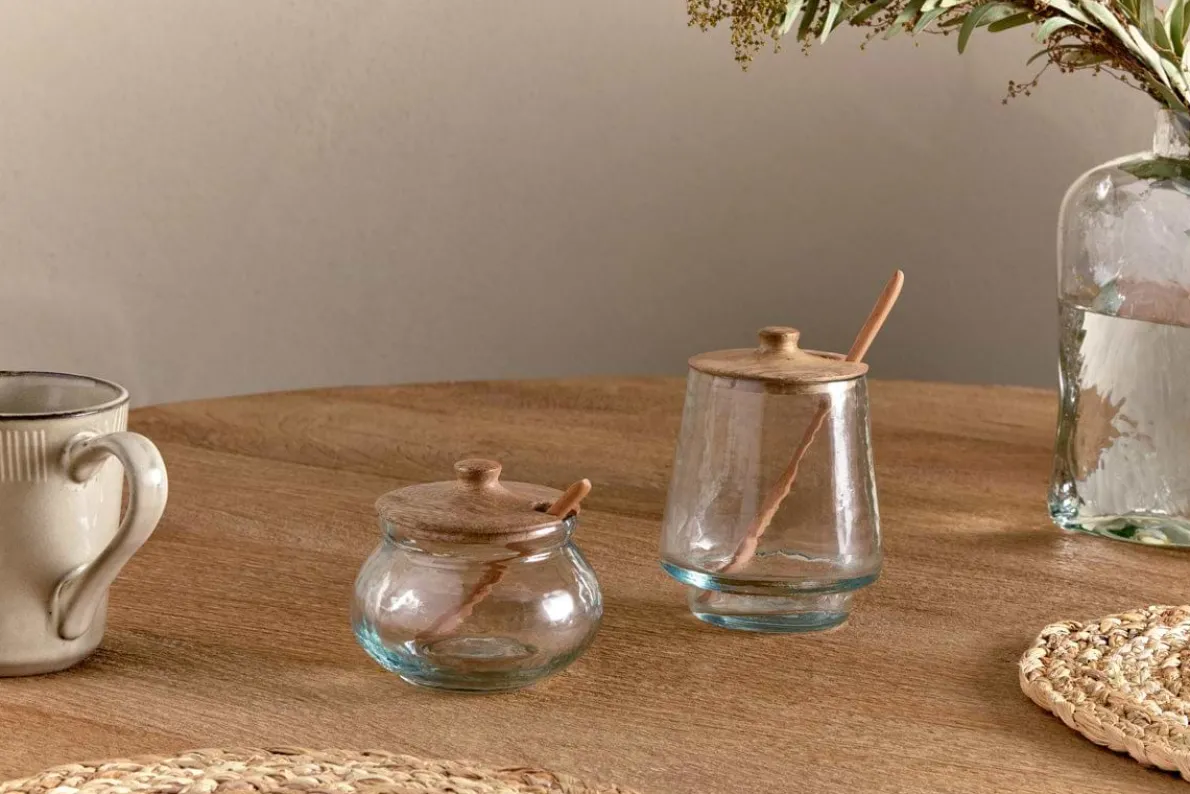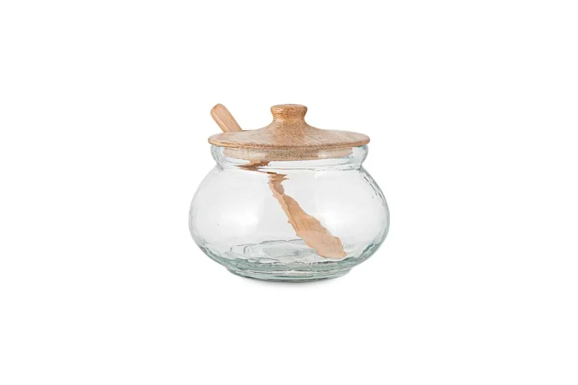 Elevating your kitchen counter and pantry cupboard storage to new levels, this beautifully crafted round glass jar with mango wood lid and spoon will add a touch of elegance to your kitchen lineup. Perfect for storing seeds, sprinkles, condiments and breakfast preserves, the soft patina of the glass brings a tactile quality to the piece as does the natural grain of the mango wood.