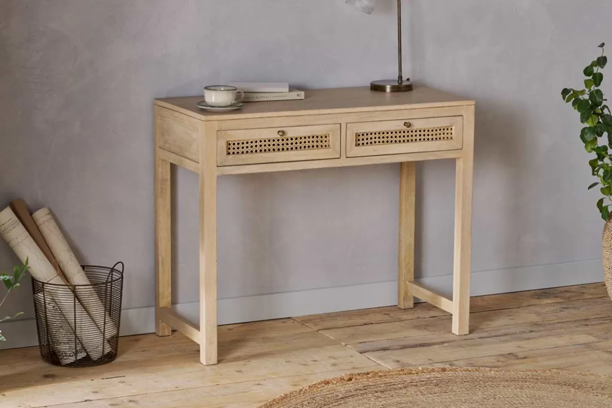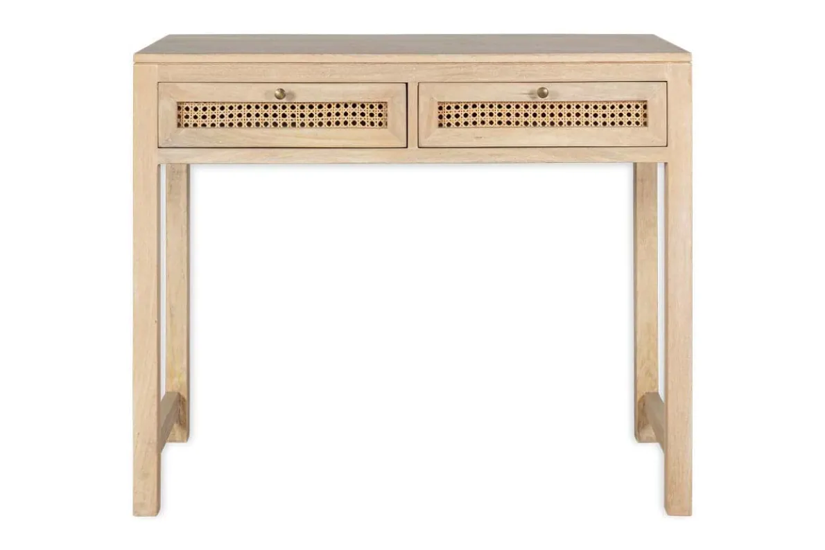 Our Kanz writing table combines a solid mango wood frame with intricately woven cane panels on the drawers for a beautifully detailed finish. The clean, uncluttered aesthetic of this piece makes it a stylish fit for any living space: perfect in a home office, sitting room or bedroom where you need to create a multifunctional area. This table is crafted from mango wood, whereby the trees are only cut down once they have stopped bearing fruit.