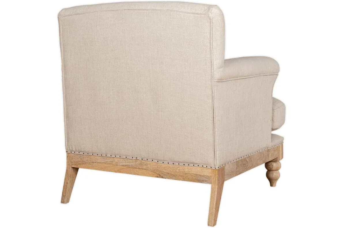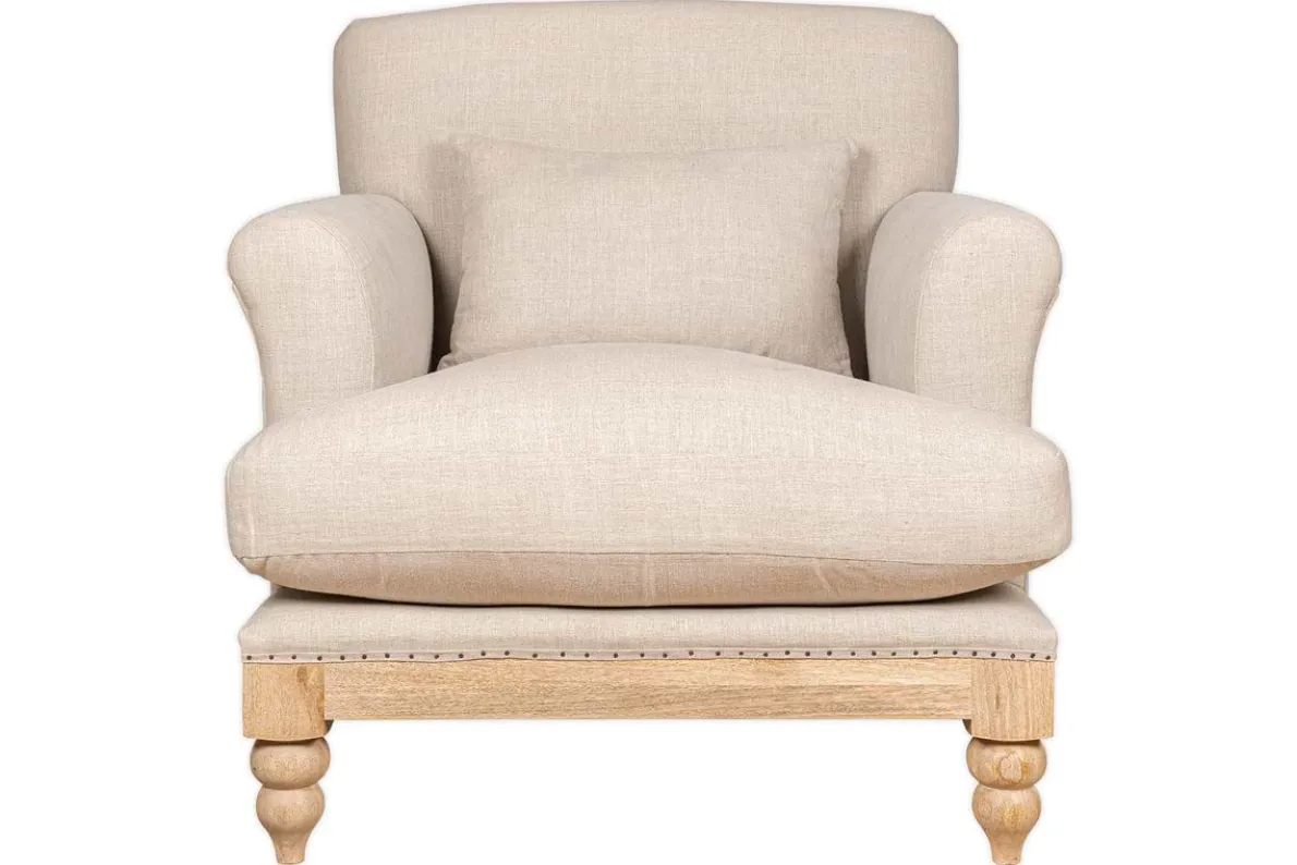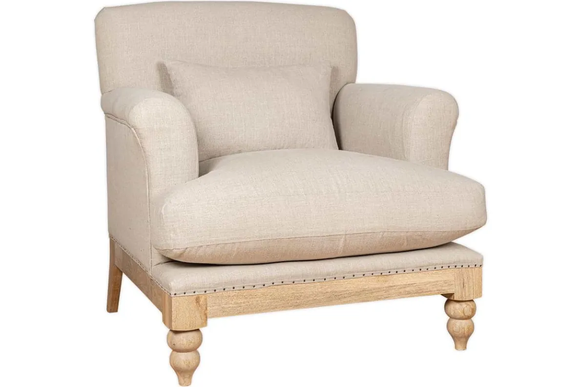 Generously proportioned and effortlessly elegant, this armchair offers both comfort and character. Upholstered in natural linen, its timeless silhouette is complemented by a solid mango wood base with subtly carved feet, adding a refined touch of craftsmanship. Ideal for a cosy nook or reading corner, it brings a sense of calm, grounded style to any space.