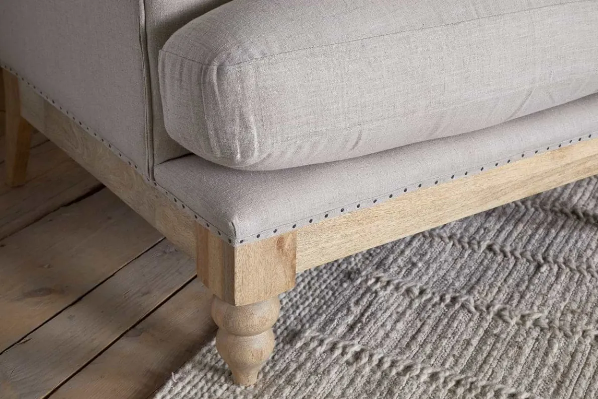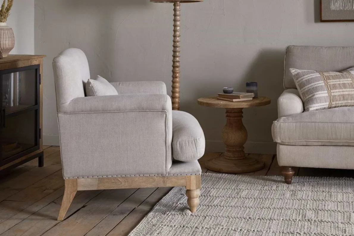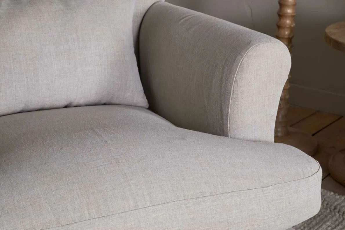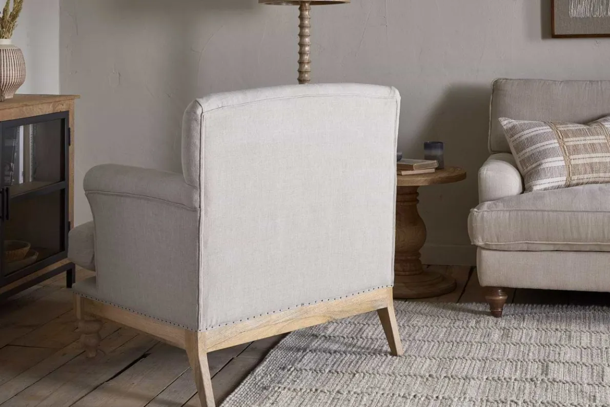 Generously proportioned and effortlessly elegant, this armchair offers both comfort and character. Upholstered in natural linen, its timeless silhouette is complemented by a solid mango wood base with subtly carved feet, adding a refined touch of craftsmanship. Ideal for a cosy nook or reading corner, it brings a sense of calm, grounded style to any space.