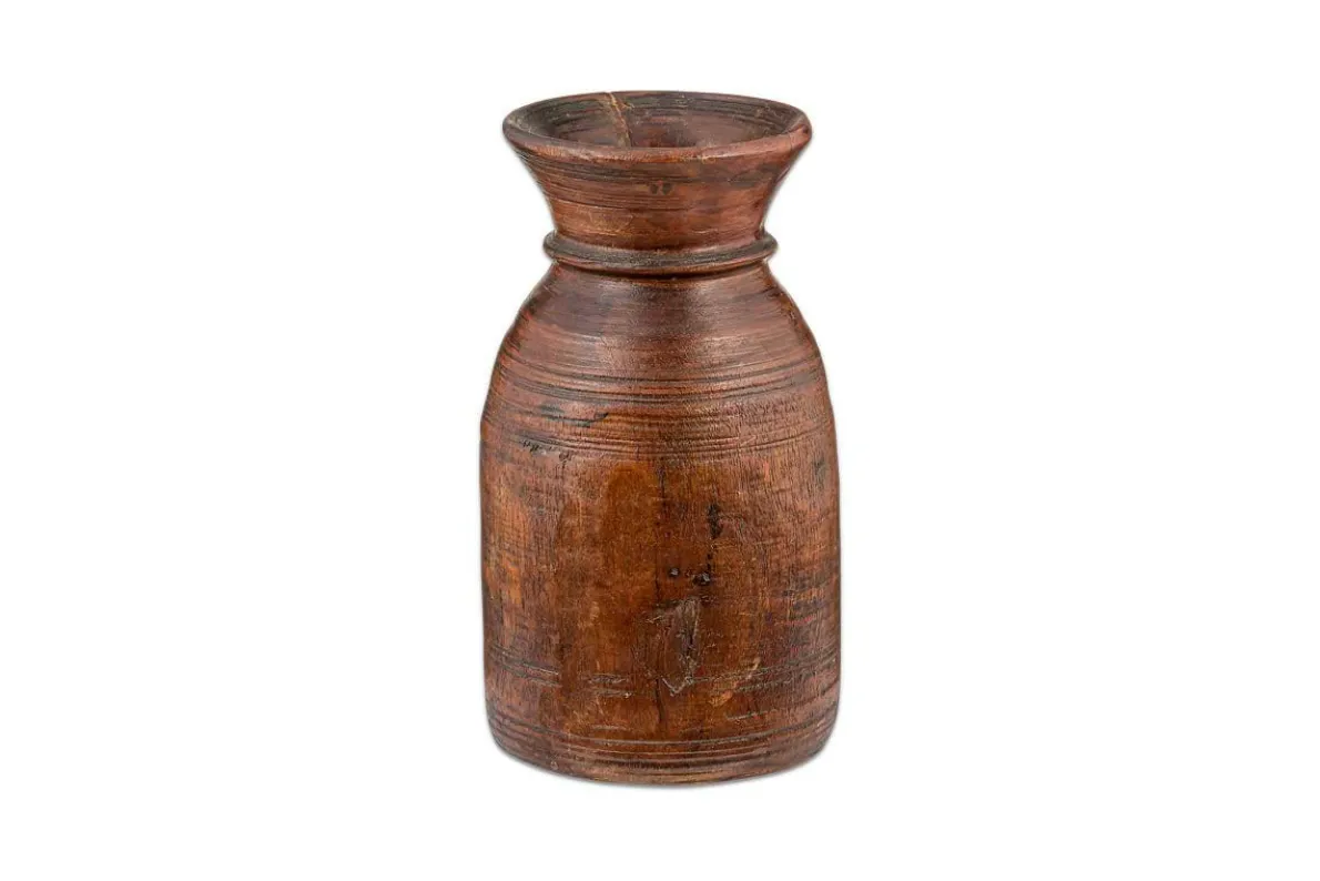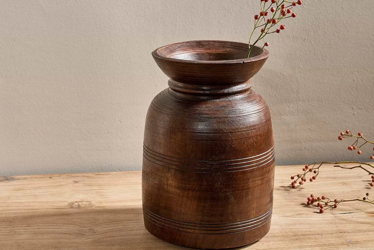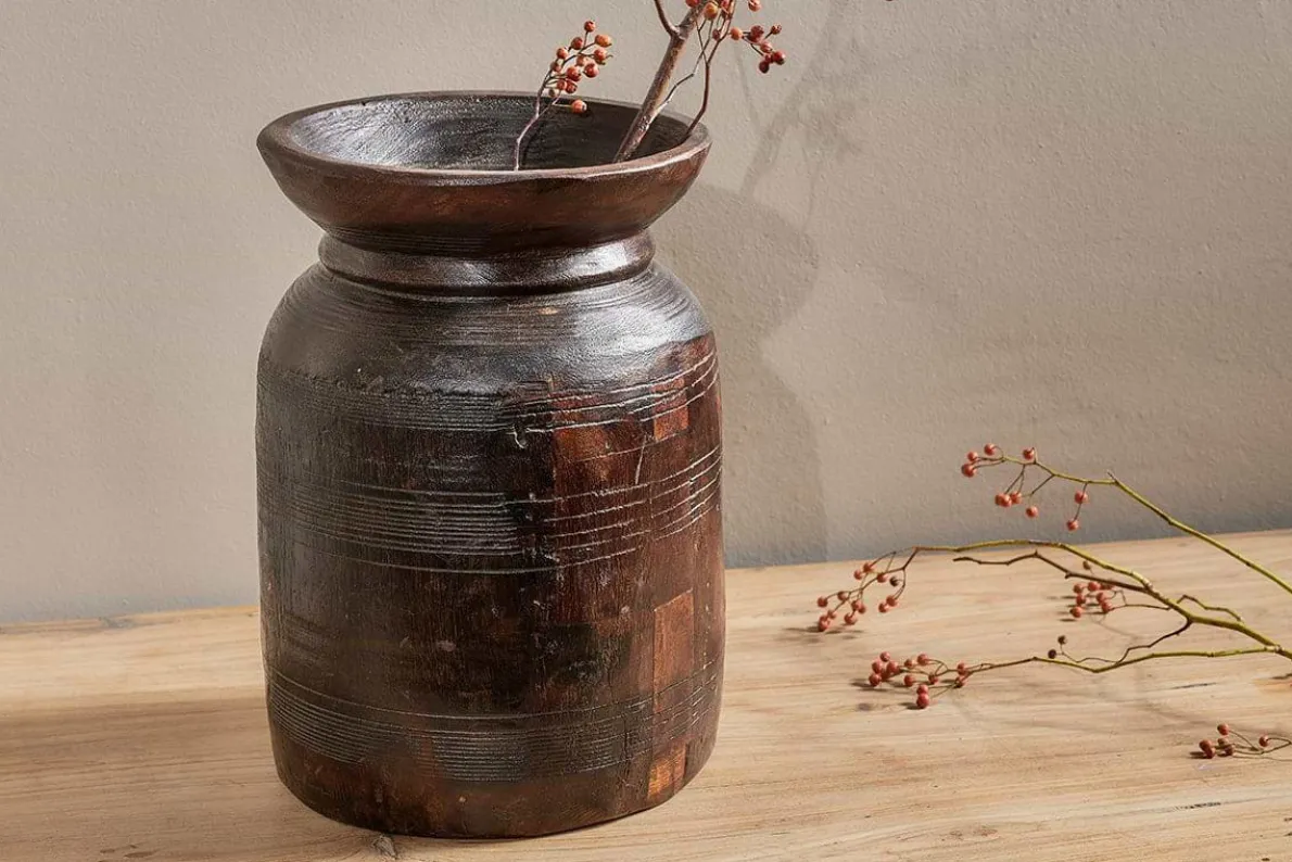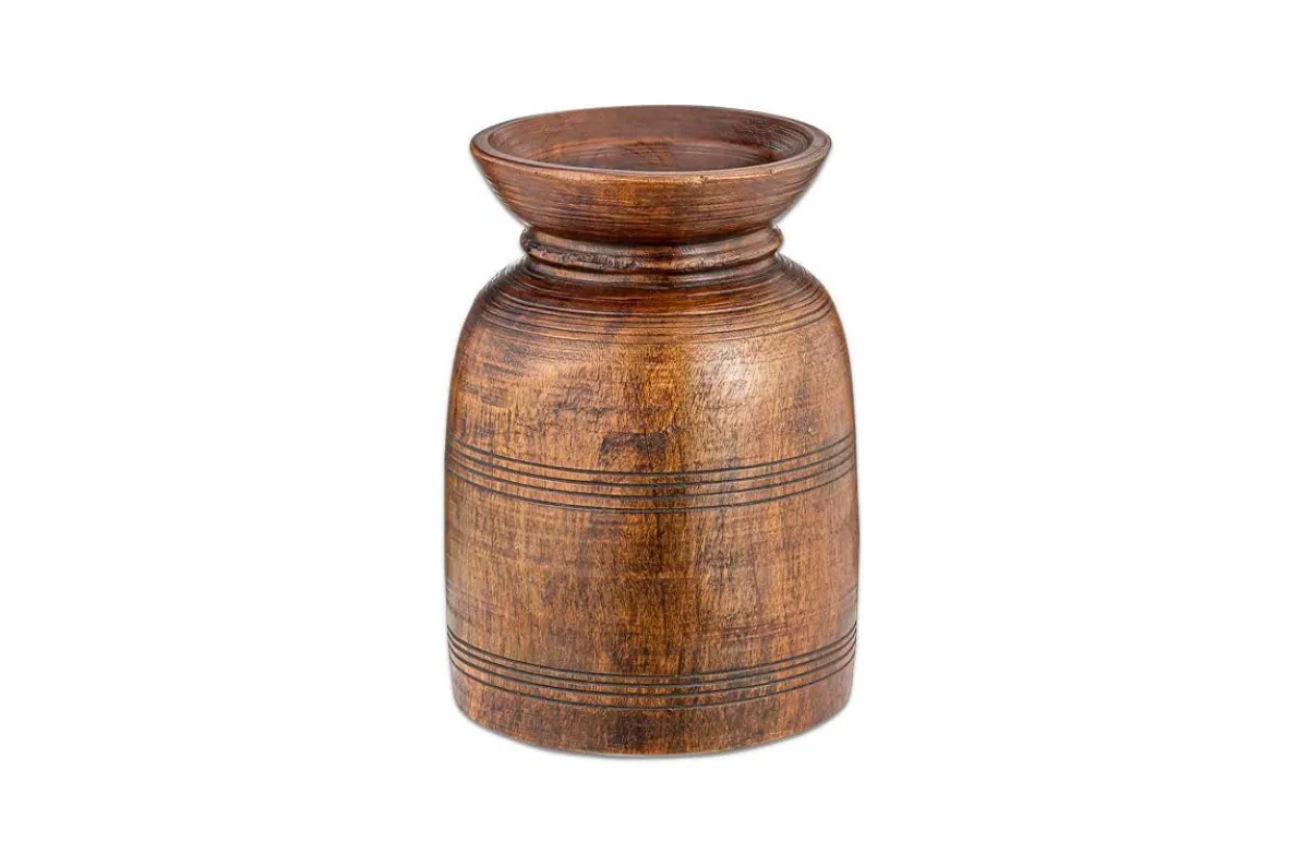 The Kawasan reclaimed tall wooden pot has an appealing dark antique tone. These reclaimed pots make an easy way to add character, texture and tone to a display. Traditionally, the Kawasan was used to store milk and honey; the pots were originally handcarved in different shapes with varying design details carved into their exterior. The reclaimed nature of the Kawasan means that there is a variation between each one, sometimes one is a little wider or a little taller. This adds to their unique charm.