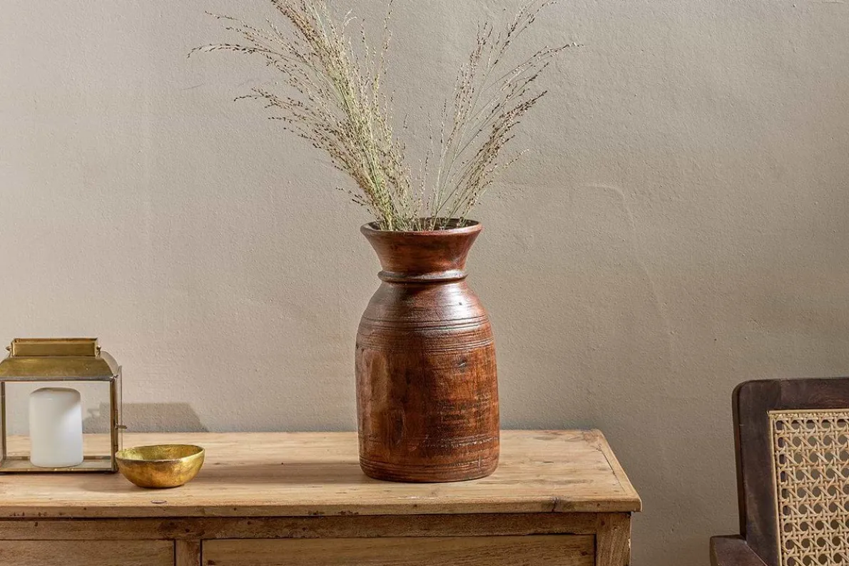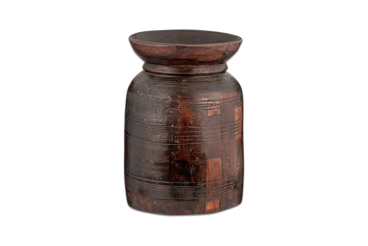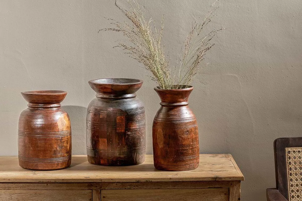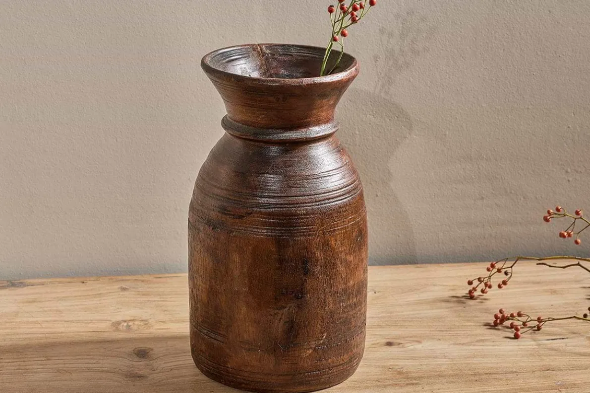 The Kawasan reclaimed tall wooden pot has an appealing dark antique tone. These reclaimed pots make an easy way to add character, texture and tone to a display. Traditionally, the Kawasan was used to store milk and honey; the pots were originally handcarved in different shapes with varying design details carved into their exterior. The reclaimed nature of the Kawasan means that there is a variation between each one, sometimes one is a little wider or a little taller. This adds to their unique charm.