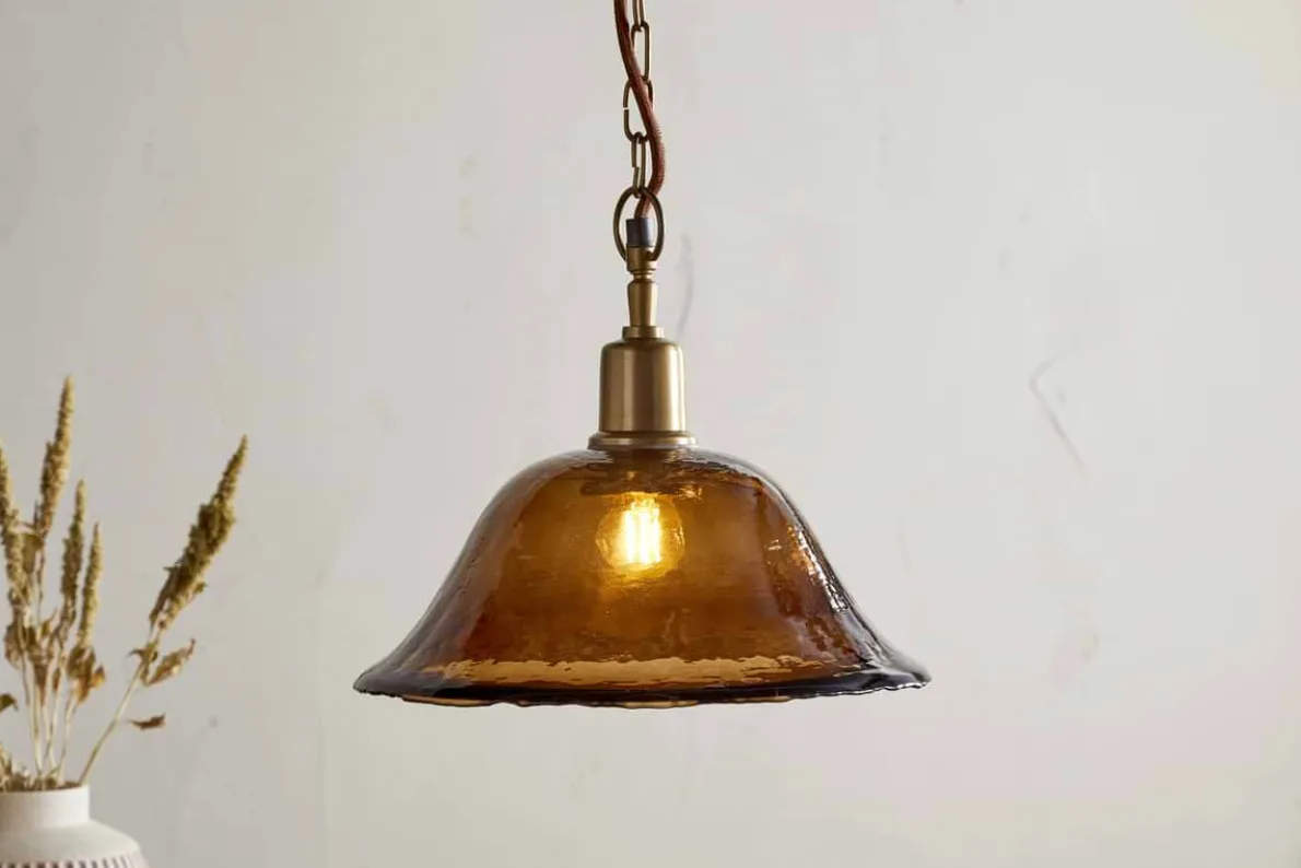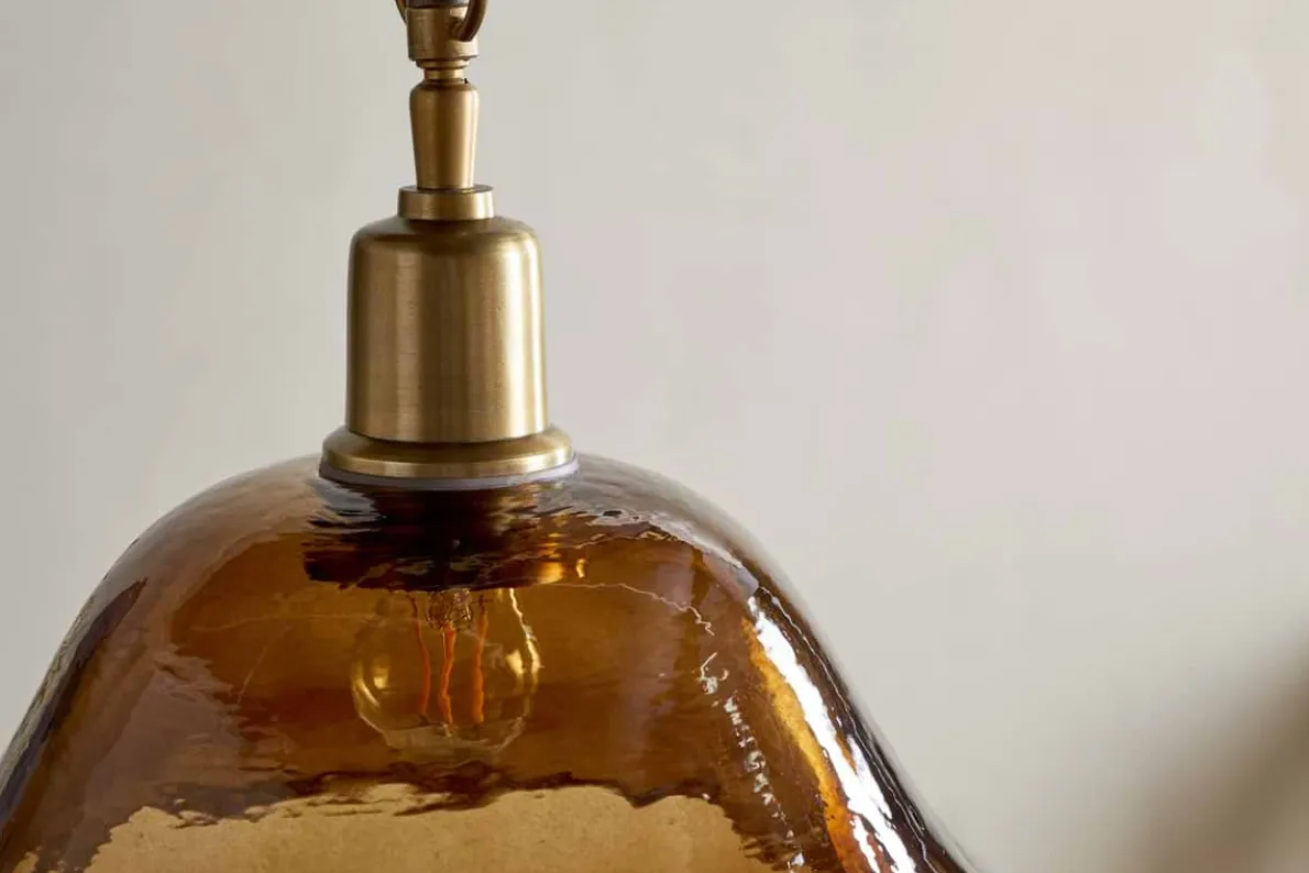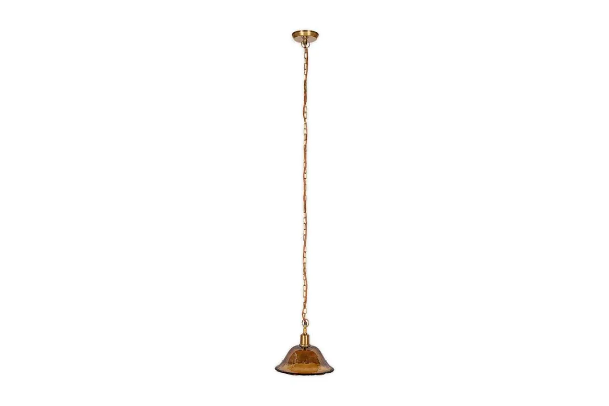 This pendant light features an organically shaped glass shade, finished with a soft lustre that catches the light beautifully. The warm tones of the glass are complemented by a rich antique brass ceiling plate, creating a refined, balanced look. Striking over a dining table or in an entranceway, it makes an elegant first impression. Available in clear or amber glass.
