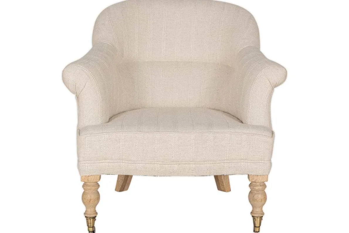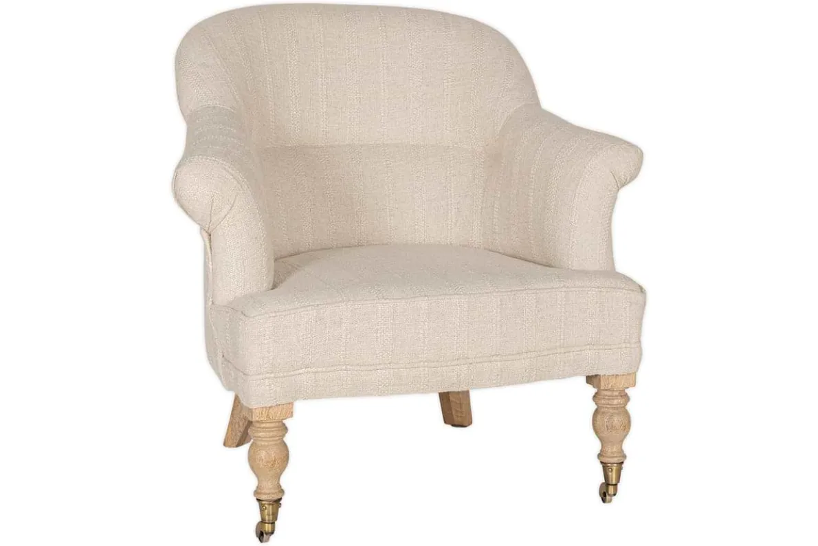 Upholstered in cotton with a subtle woven stripe, this tub-shaped armchair offers a soft yet structured presence. The hand-carved mango wood legs add warmth and a touch of detail. The front two legs are set on castors for effortless movement. A timeless accent for any reading nook or living space, this piece is invitingly comfortable and beautifully crafted.