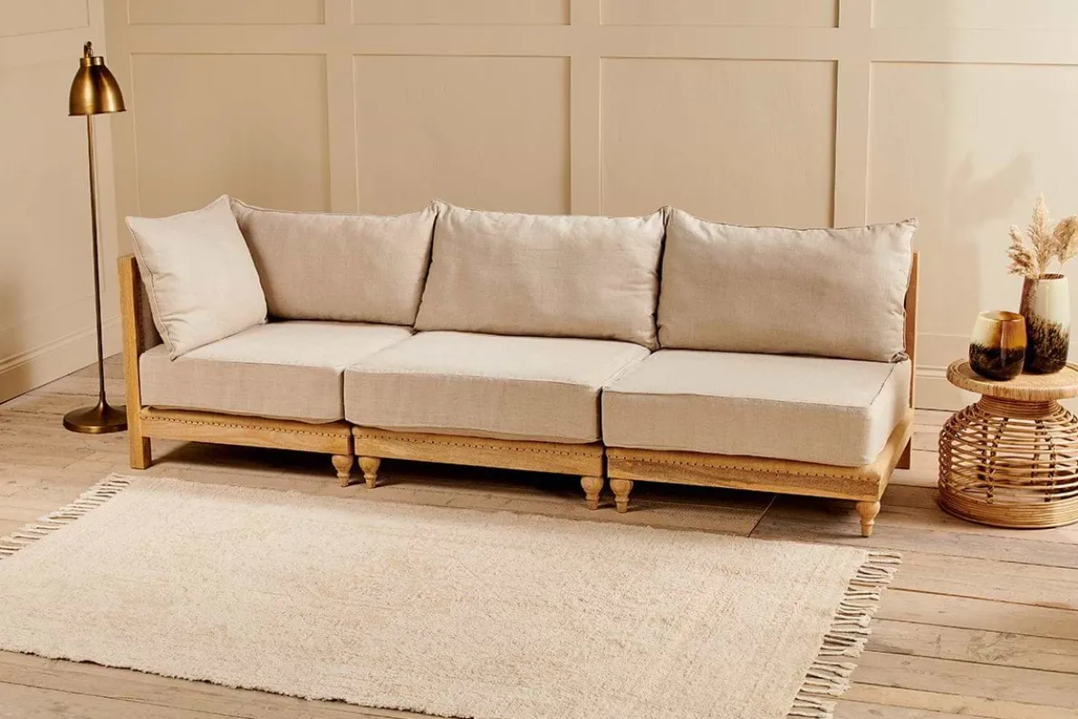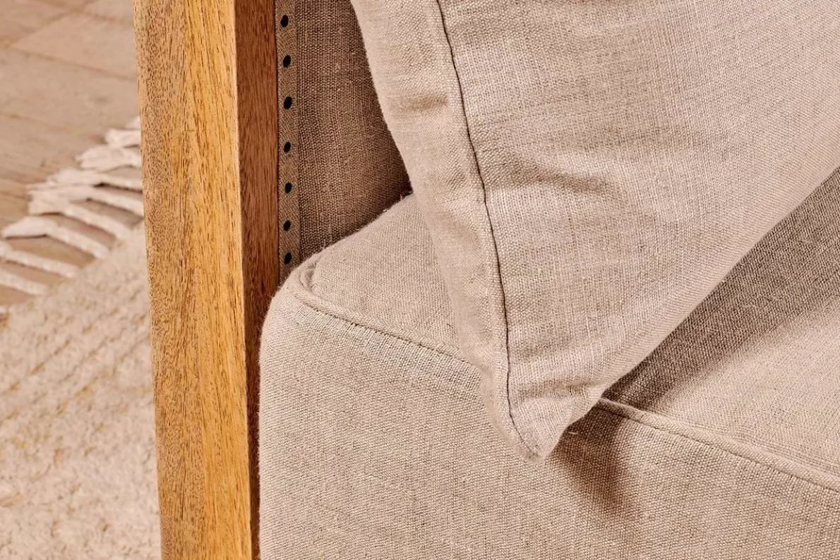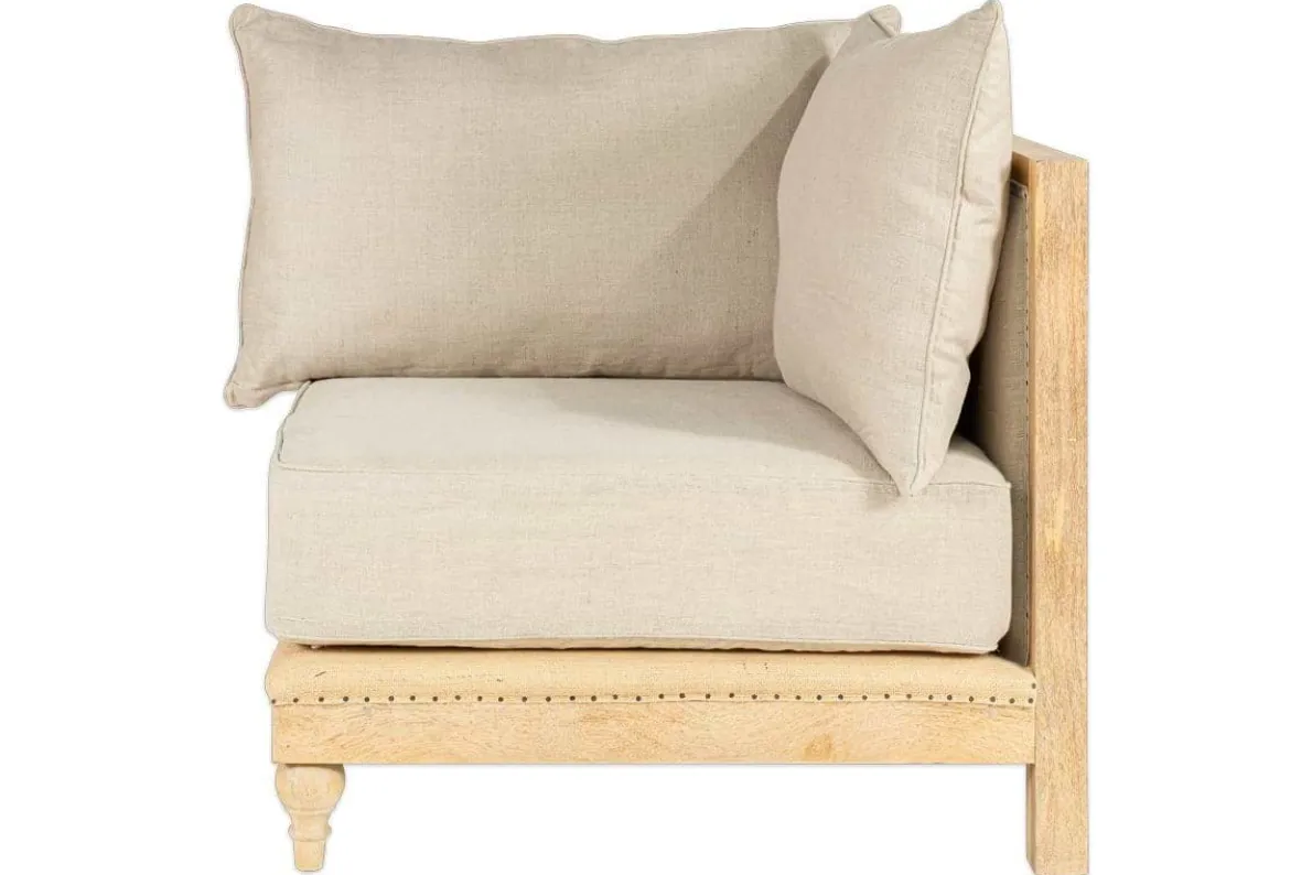 Our Krissa corner module forms part of our Krissa Modular Sofa collection. Add as many modules as you need to create your own bespoke corner configuration. The frame is expertly constructed from solid mango wood and the legs have a simple turned detail. The back and base of the corner are upholstered in natural linen, as are the firm seat cushions and soft pillow style back cushions. The deconstructed back of this elegant piece is a real point of difference. The hessian weave showcases the craftmanship and skill of the handmade process.The Krissa sofa comes with iron clamps that can easily be applied under the seat of each module to ensure there is no movement.