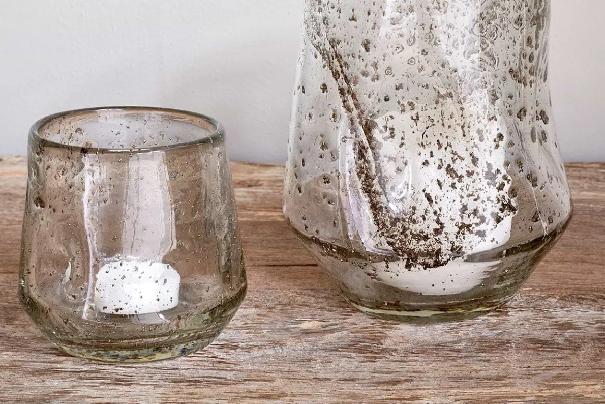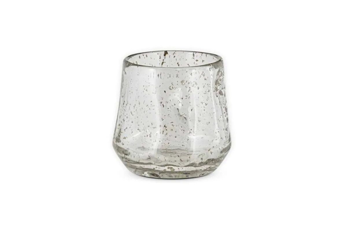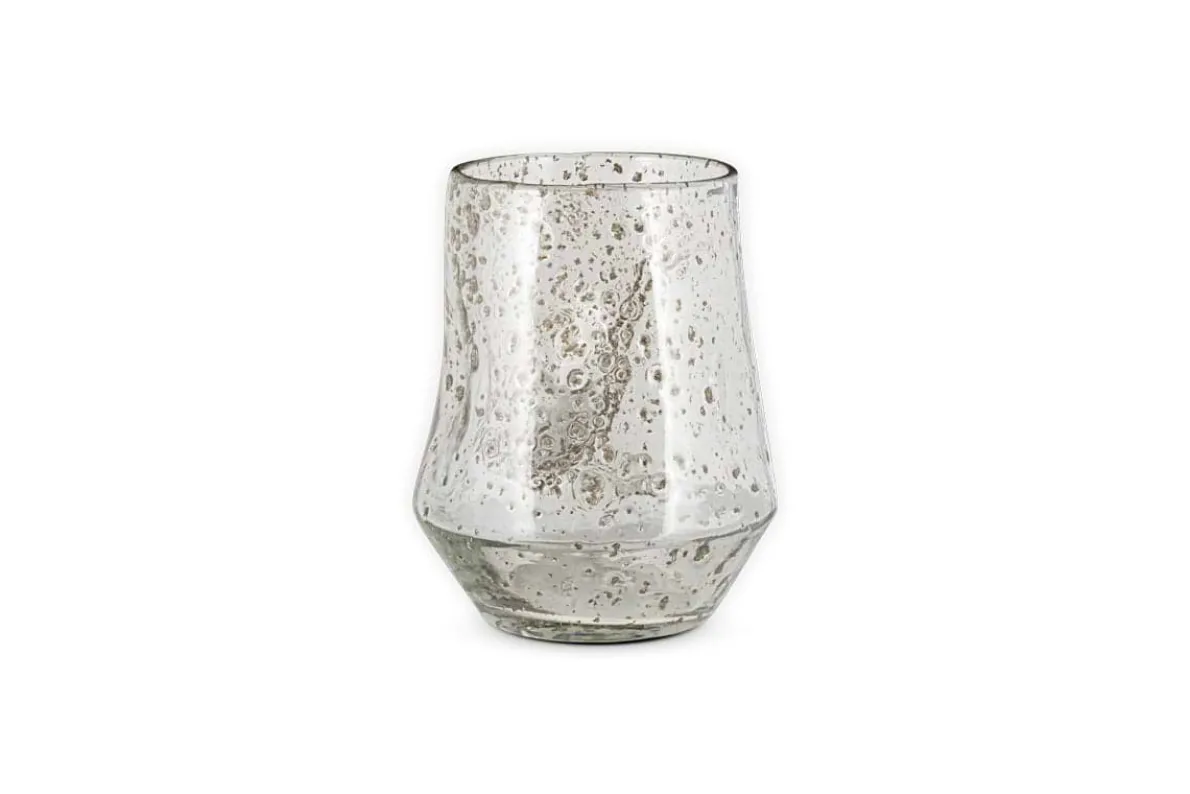 These unique pieces are crafted with care from hand-blown recycled clear glass mixed with slivers of aluminium to create a unique pattern for a subtle lustre that gives a delicately ethereal glow when a candle is lit inside. The organic shape, with its pinched detailing, is created by an artisan using tongs when the glass is removed from the mould, meaning no two pieces are alike. Available in two sizes.