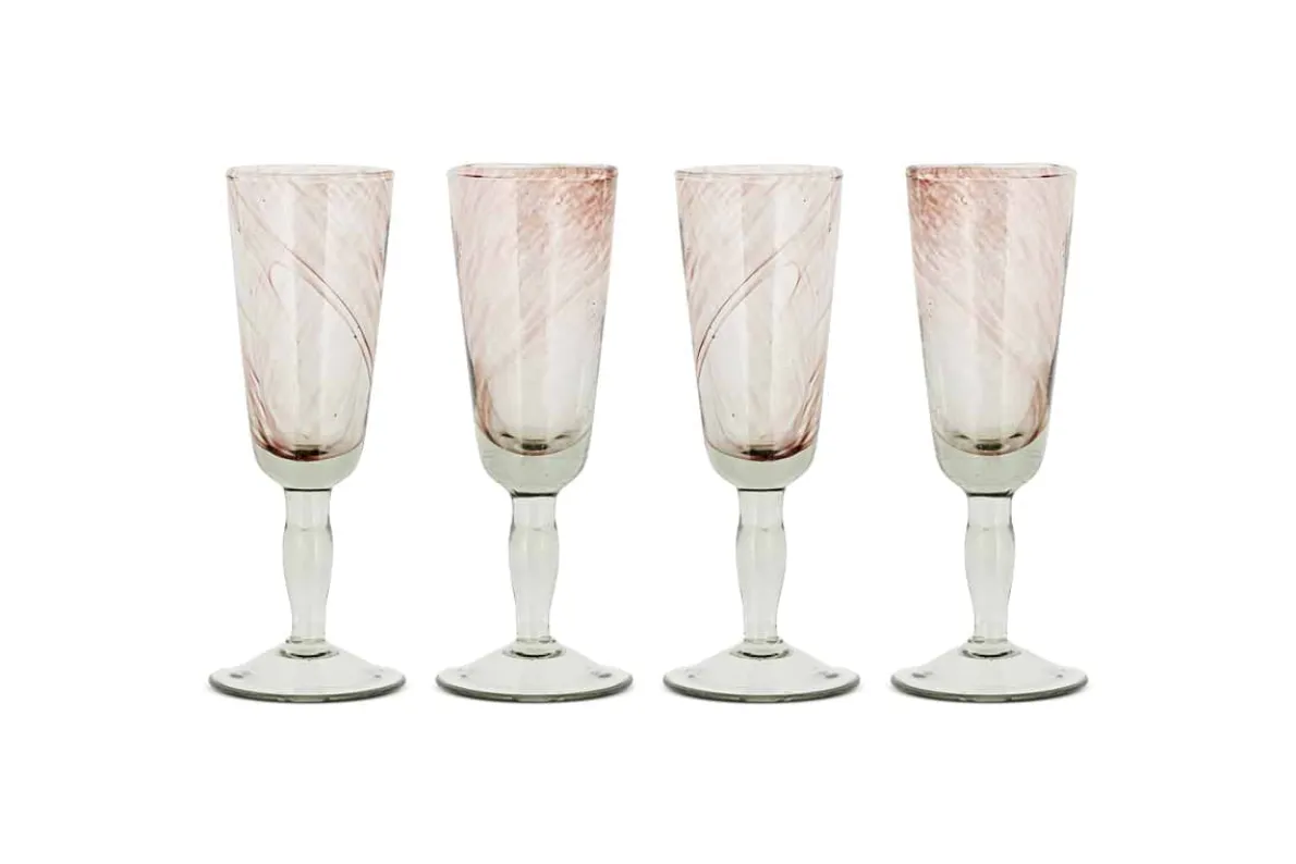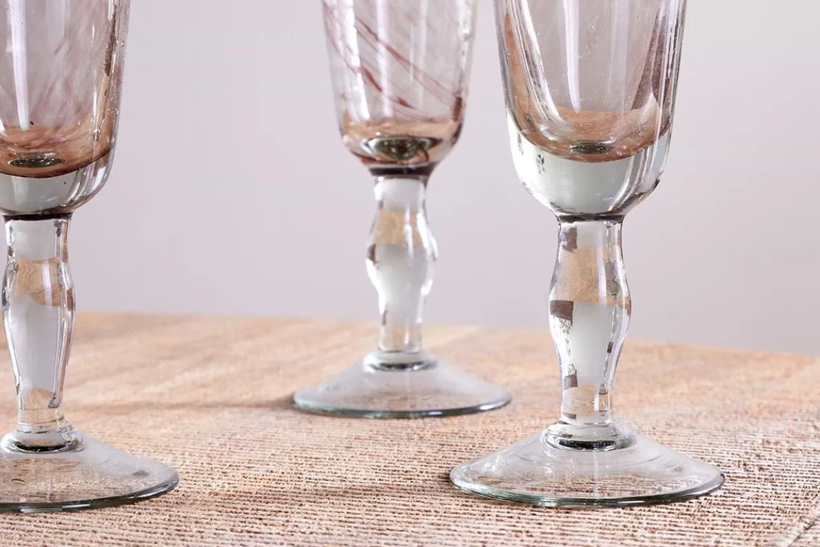 These richly coloured Llanera champagne glasses are hand-blown from recycled glass and make a striking addition to any table setting, adding depth to a neutral table or complementing darker dinner sets. The organic shape and tactile finish are relaxed and understated, while the contrasting clear stem and swirled plum drinking vessel draw the eye and create a stylish accent. As these are hand-blown, no two are the same and each piece has its own unique character. It comes as a set of four and coordinates with our Llanera tumblers and wine glasses.