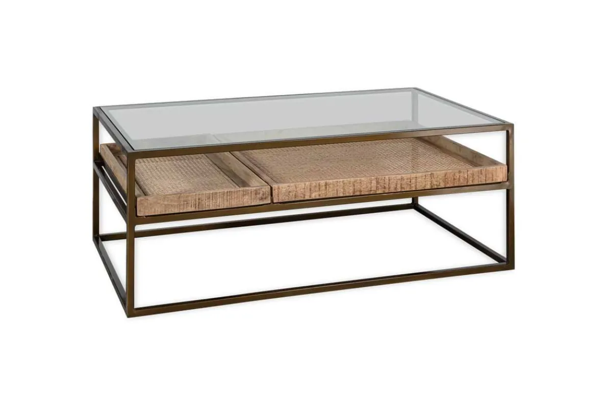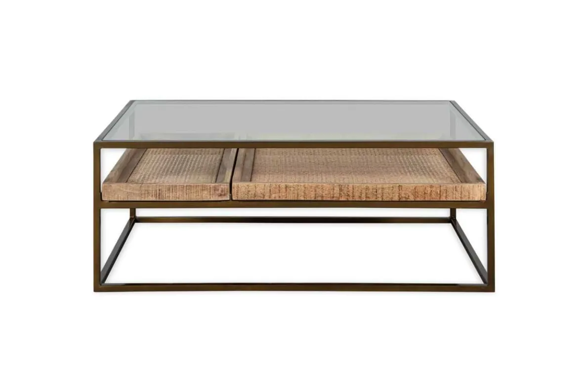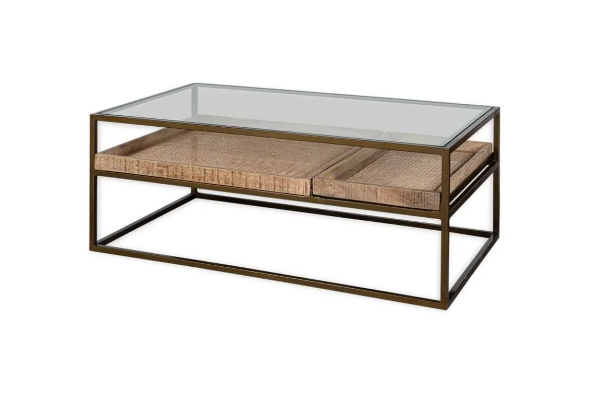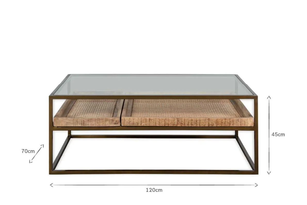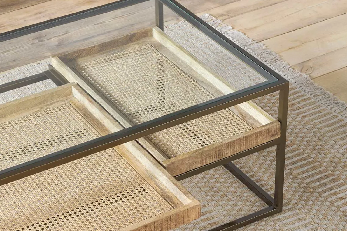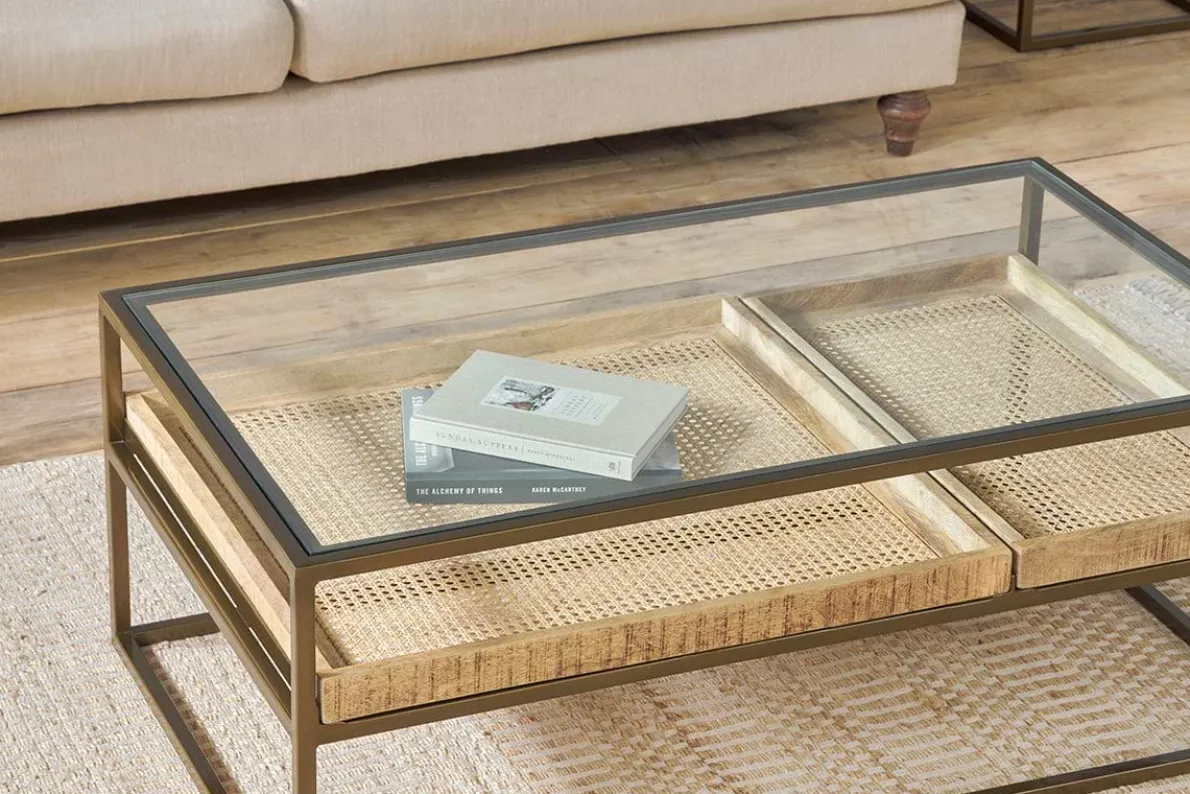 Our Luzon coffee table is an effortlessly classic piece. The stylish glass and brass-plated iron design has a sophisticated appeal, complemented by the two removable mango wood and woven cane trays that add interest as well as functionality to this statement piece. Style the bottom trays with found treasures or stack neatly with books, keeping the top clear for candles and a few favourite decorative objects.