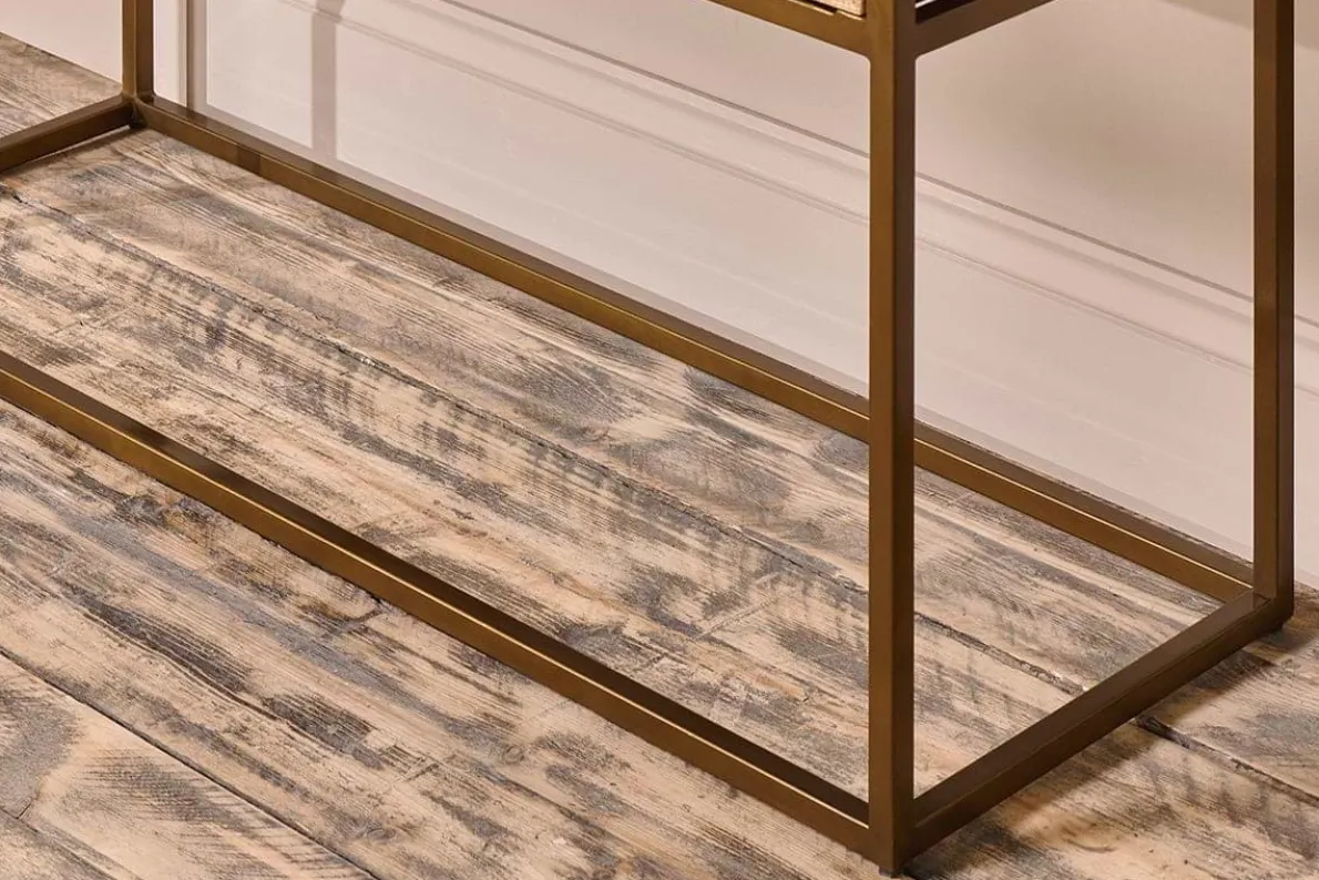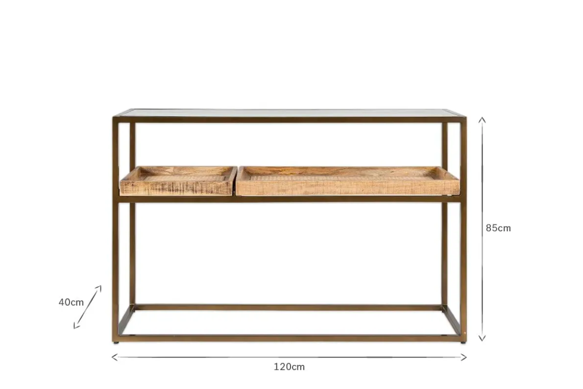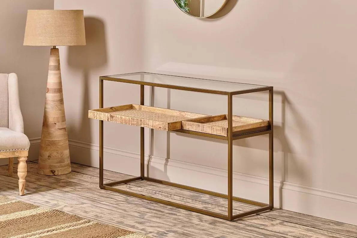 The striking Luzon display console table is the perfect piece for showcasing unique decorative items. The console table features a clean brass frame, a clear glass tabletop, and an attractive lower shelf that is crafted from wood and cane. The lower shelf has two parts: a large rectangular removable tray and a smaller square tray. Style this lower shelf with decorative objet or neatly stack your favourite books, keeping the top clear for a statement lamp or tealights.