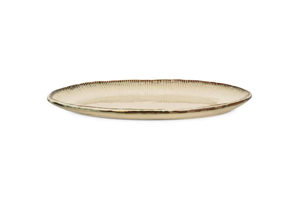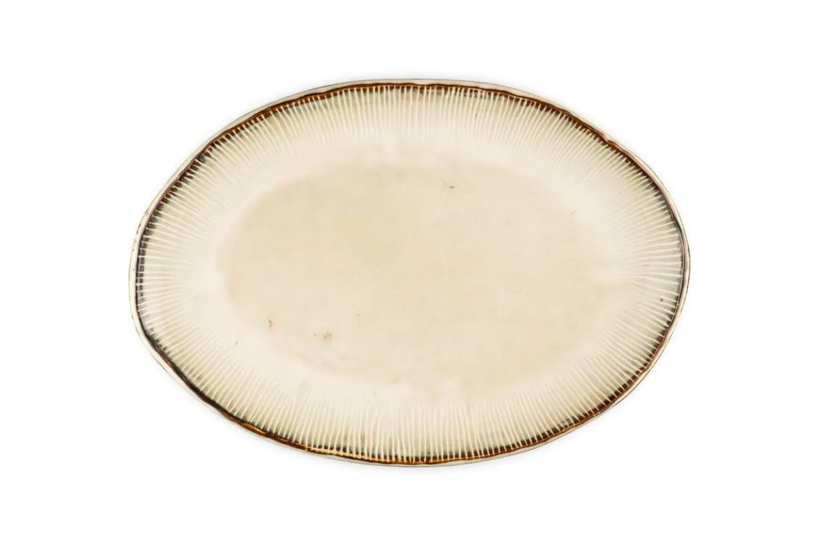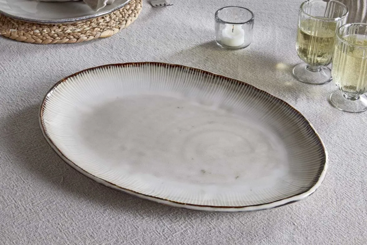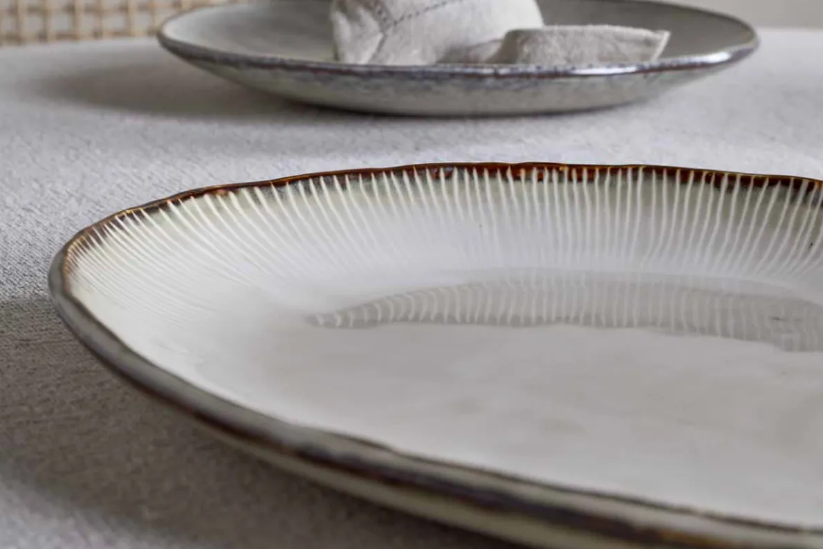 The Malia serving platter brings understated elegance to the table with its smooth, organic shape and reactive cream glaze. Each piece features subtle variations in tone, making it beautifully unique, while a fine hand-painted line around the rim adds a delicate finishing touch. Generously sized for sharing feasts, appetisers, or desserts, it-s a beautiful piece for special occasions.