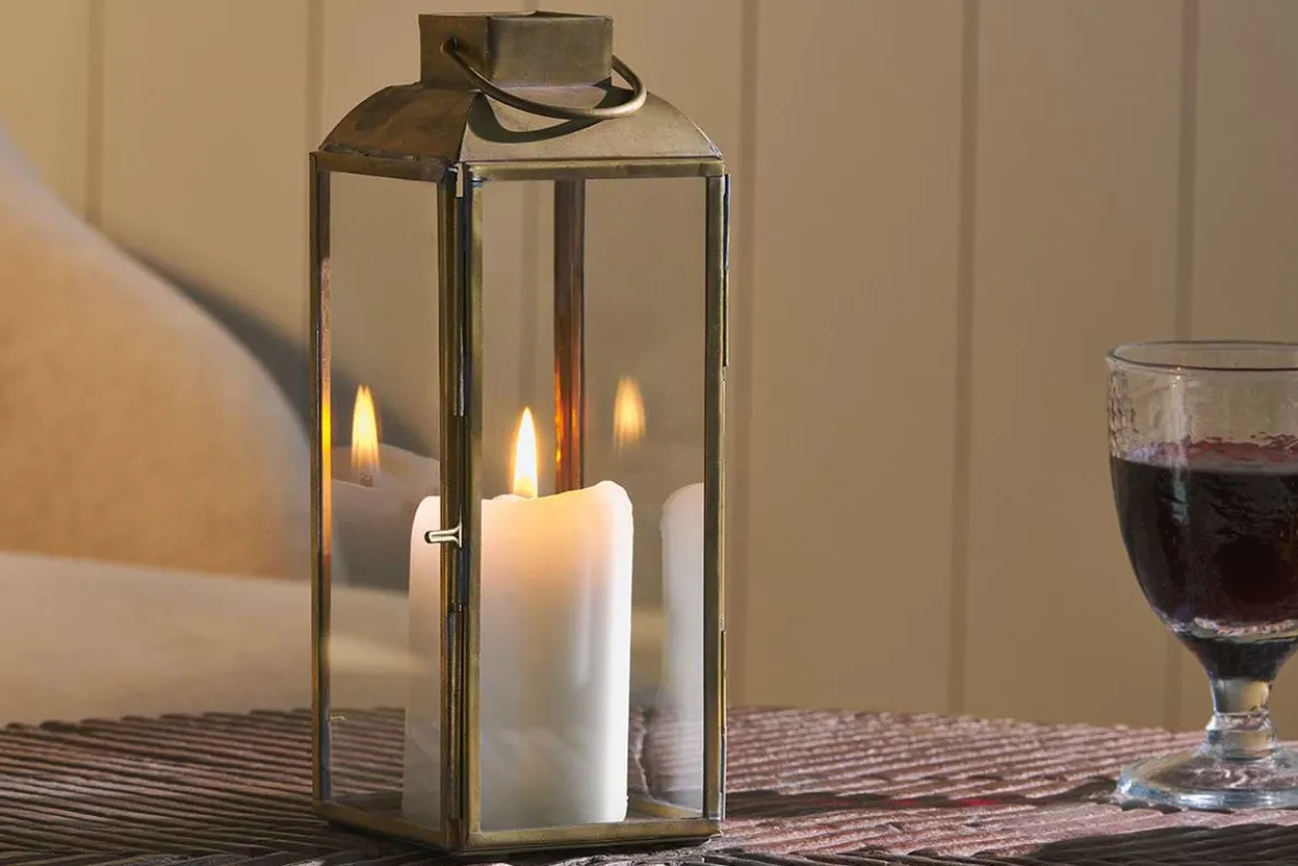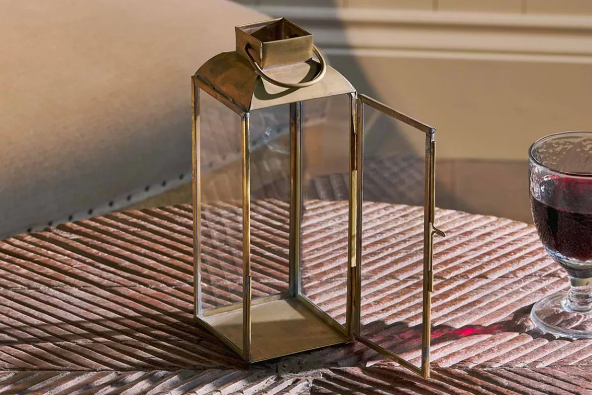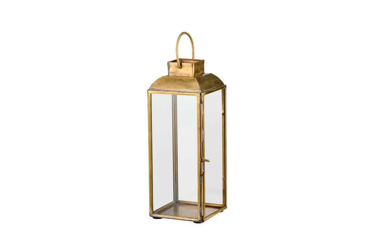 The tall Maro lantern is crafted from brass with four clear glass windows, skilfully framed in brass. The lantern has a brass sheet base and simple carry handle, and the glass door neatly opens with a simple pin fixing, allowing you to place a tea light inside. It is the perfect height for a mantelpiece display.
