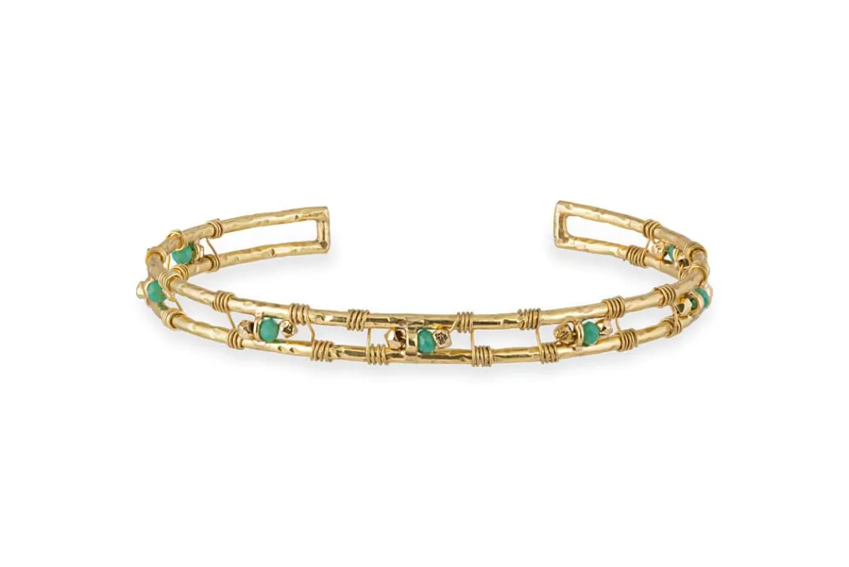 Delicate and stylish, this beautiful cuff-style bracelet boasts the perfect summer pairing – turquoise chalcedony, that brings to mind crystal clear seas, nestling among a warm gold plated setting. Chunky and eye-catching with intricate wirework and a simple double frame that holds seven semi-precious stones, this is a striking piece that would look beautiful alone or paired with other pieces from our collection.