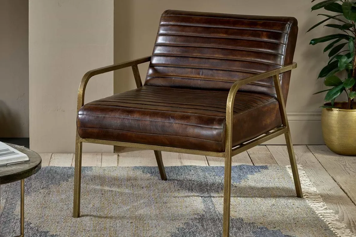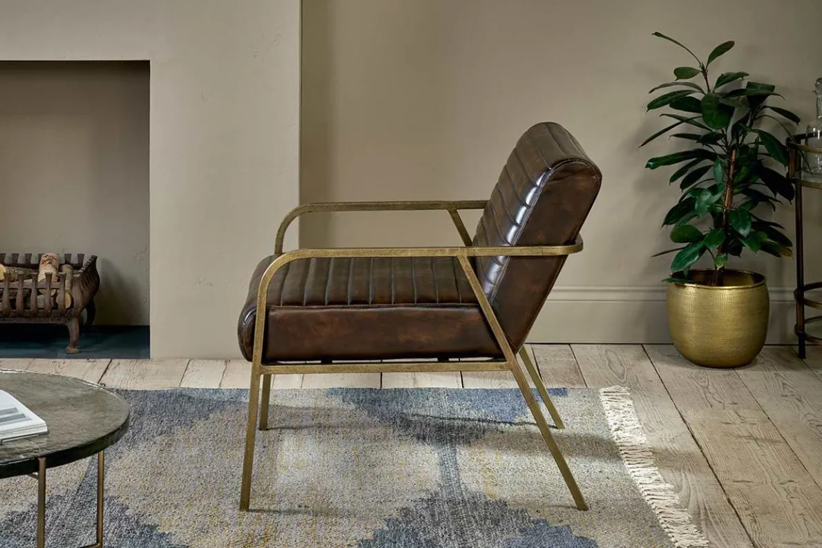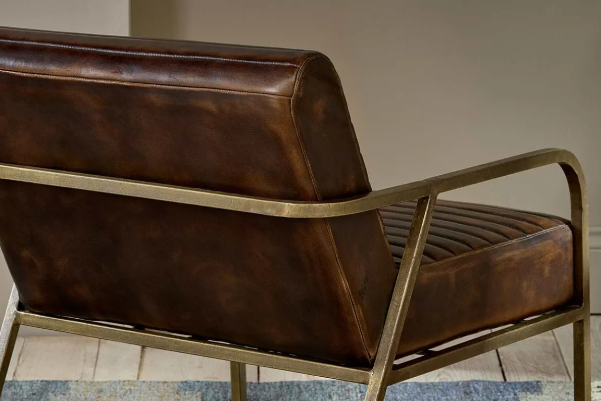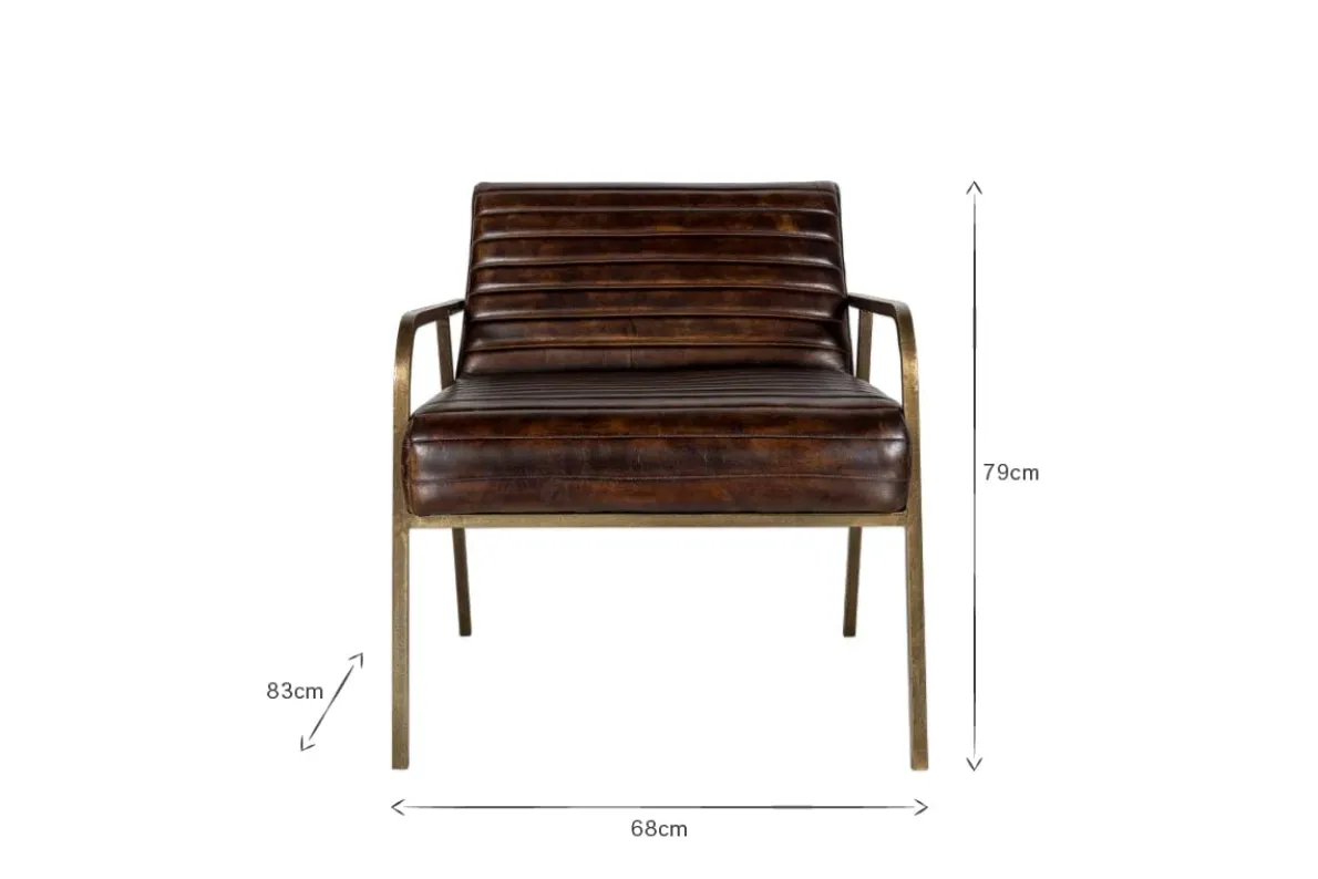 Our Mirai armchair is a statement piece that will add interest and comfort to any living space. Handmade from buffalo leather that has been aged for a beautiful patina and depth, this timeless design has a heavy cast iron frame with a brass finish that perfectly offsets the dark leather. It works well as a reading chair in a home office, or equally in the corner of a bedroom or living room.This leather upholstery is a by-product. The herds are farmed by local herdsmen and the leather is dyed using vegetable extract and tree bark, this means the leather colour will enrich further with time.