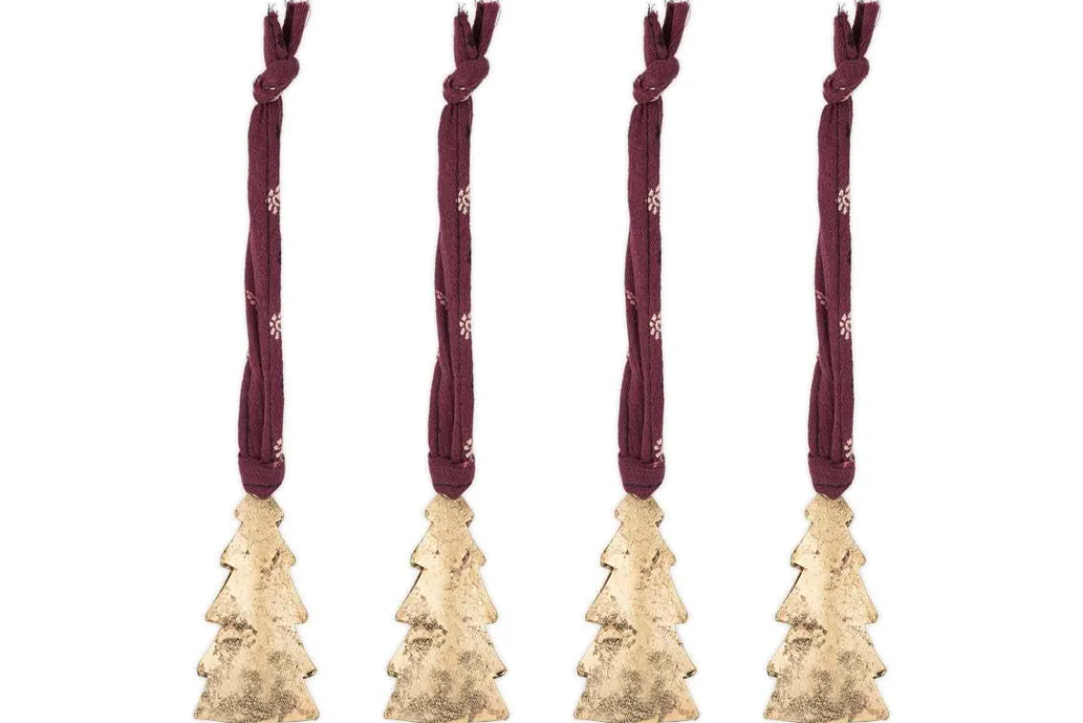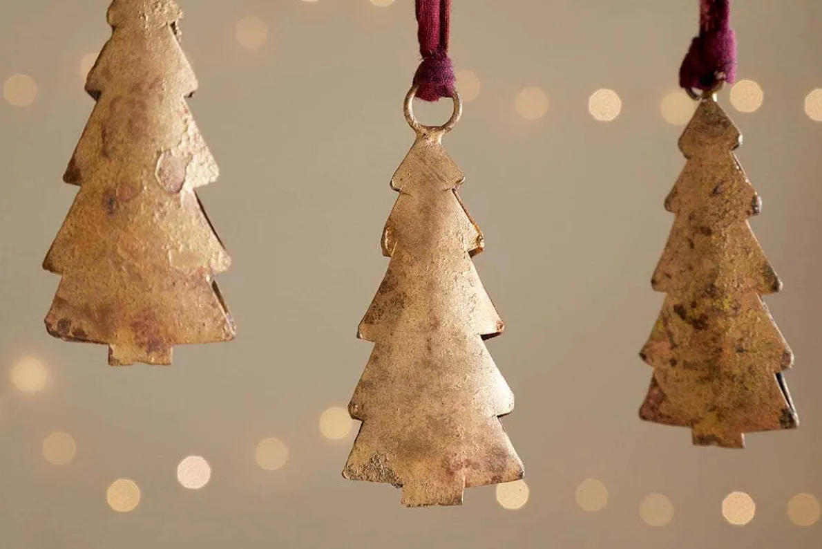 These iron baubles feature a striking tree silhouette with an antique brass finish, bringing warmth and character to any festive display. Their slim profile make them ideal for hanging on branches or incorporating into decorative arrangements. Finished with vibrant sari ties, they add a touch of colour and texture to seasonal styling.