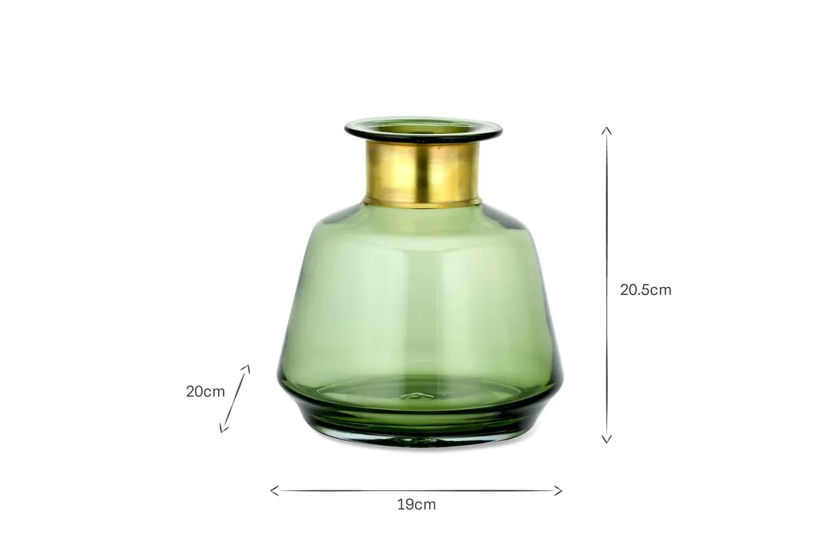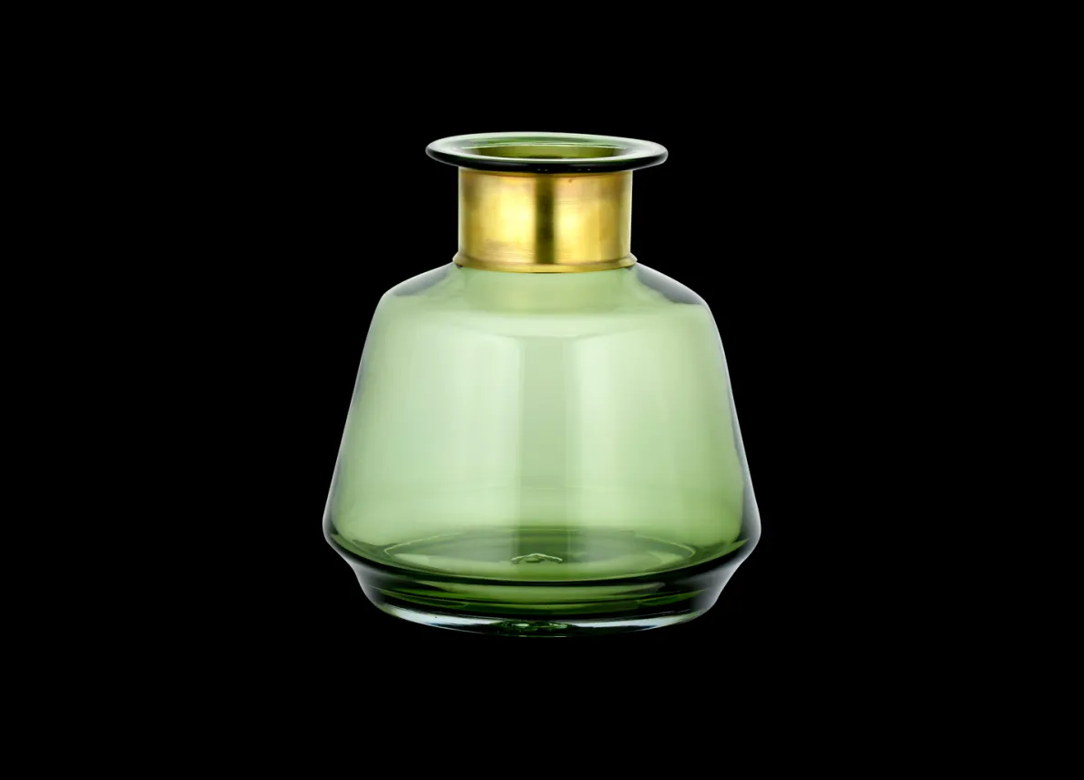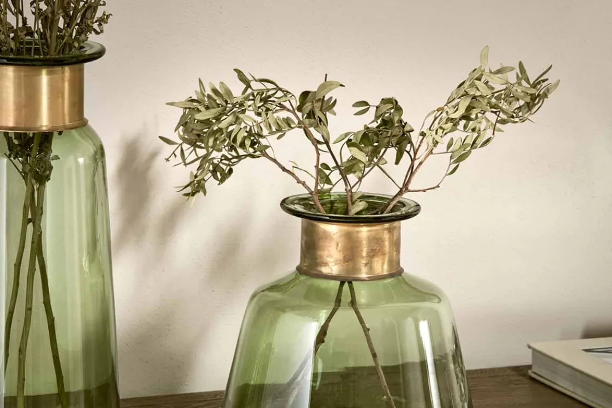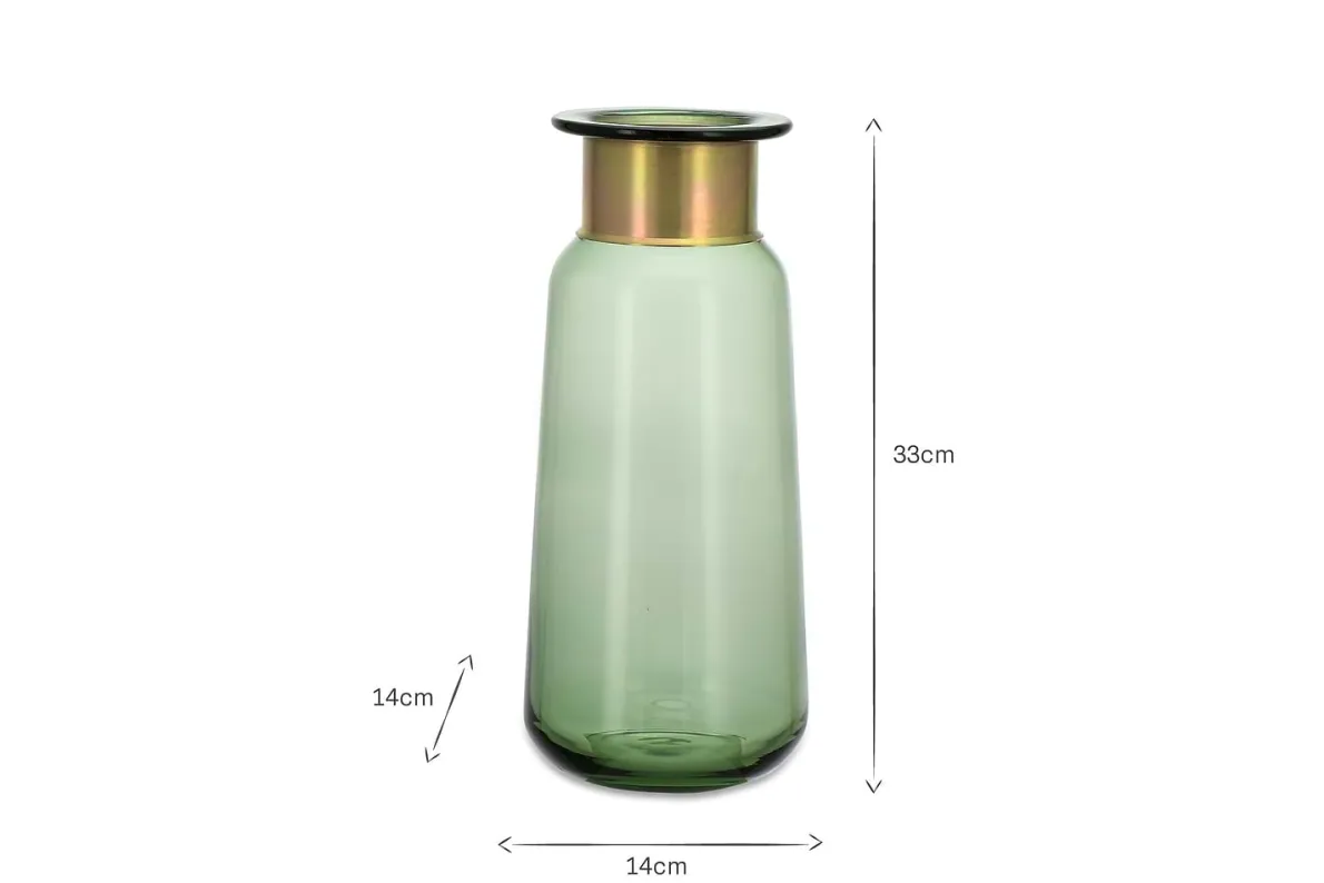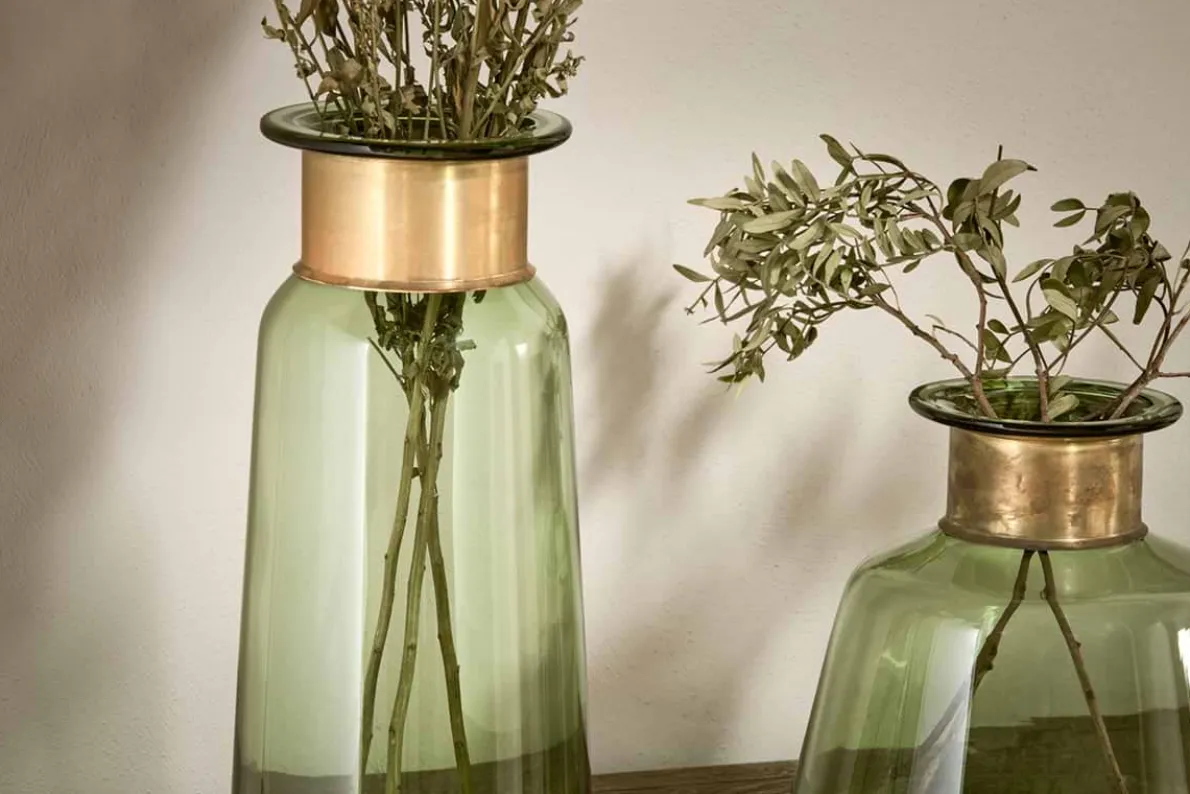 The sophisticated green tones of our Miza coloured glass vases are enhanced by the golden decorative ring at their neck. The coloured glass has a crisp, clean quality.