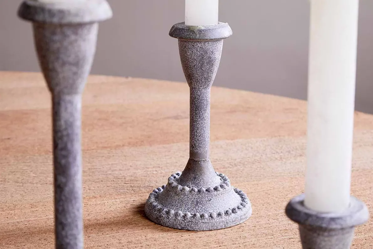 Our Moremi Candle Holders, sold as a set of three, are perfect for styling on a dining table or sideboard. The aged zinc finish gives them a rustic, unique feel, while the delicate design details add a subtle, elegant touch. Easy to mix and match in any space, we love how versatile these candle holders are. Pair with our rustic soy blend Dinner candles.