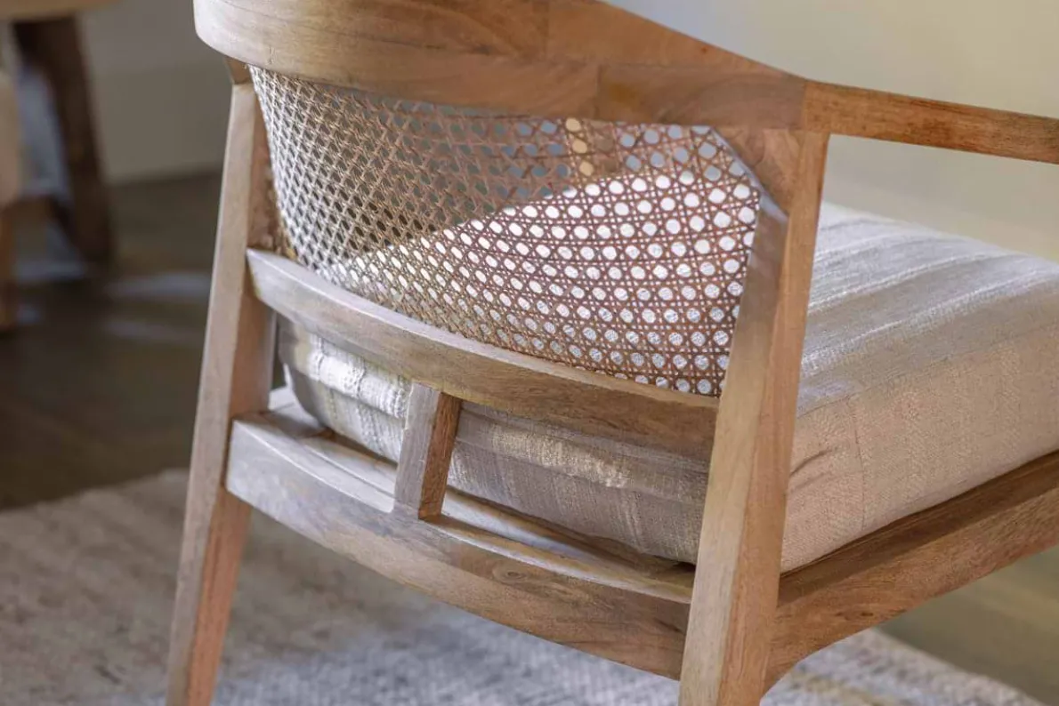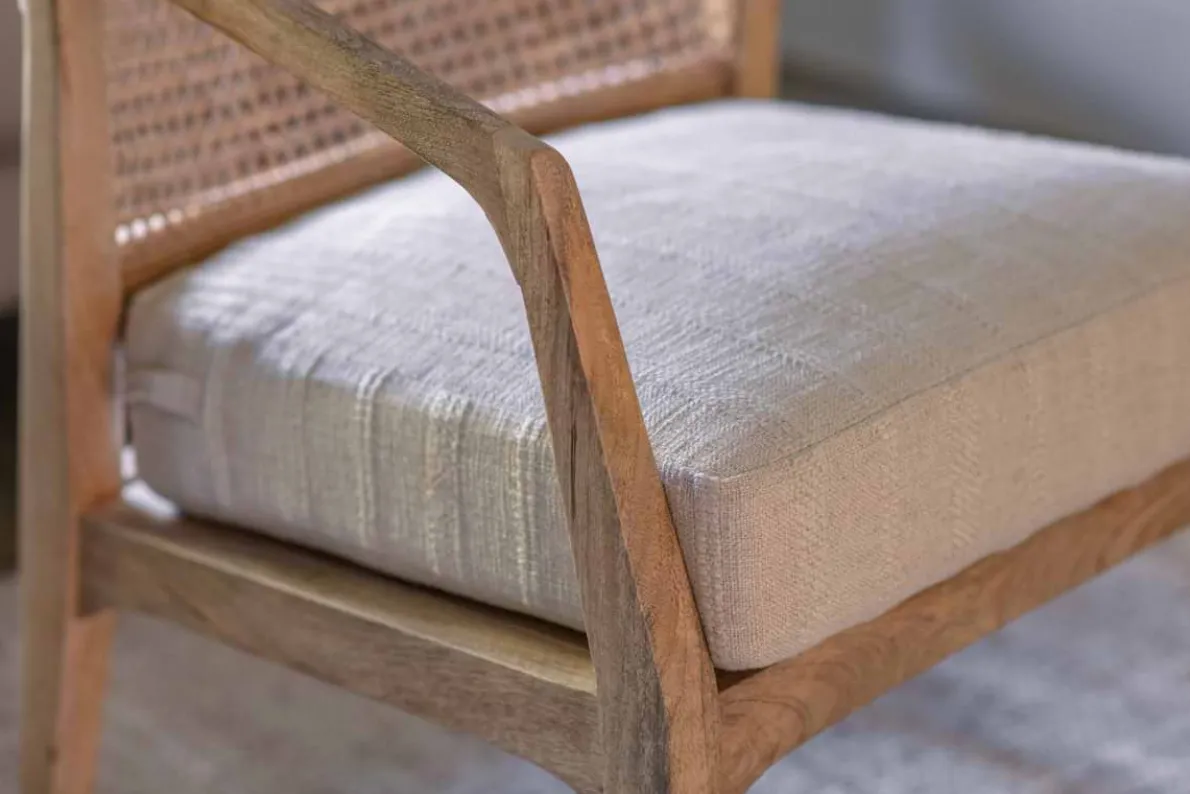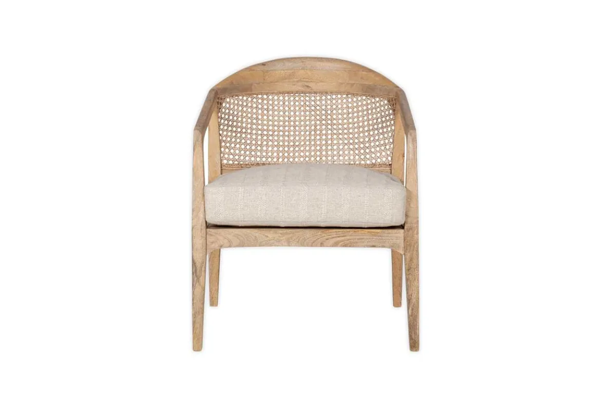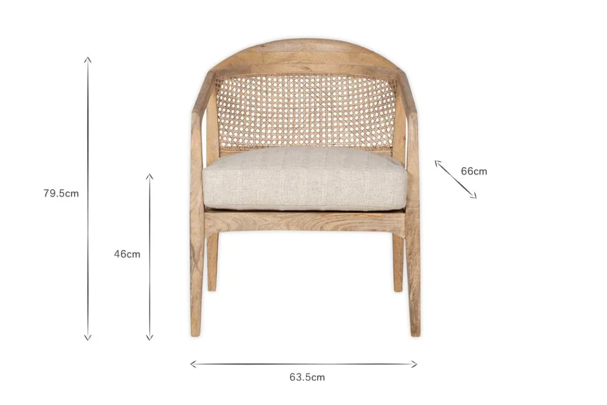 Our Nabhi chair is a perfect example of timeless design that marries time-honoured craftsmanship with natural materials. This beautifully proportioned piece is handcrafted from solid mango wood with a simple organic silhouette that follows a natural curve, creating an elegantly tactile frame that is as supportive as it looks inviting. A handwoven cane panel adorns the back, creating a comfortable support, while the generously upholstered slubby cotton cushion is supremely soft and lends an overall understated look to this skilfully crafted piece. An heirloom piece that will look striking in any living space, from reading nook to bedroom or garden room.