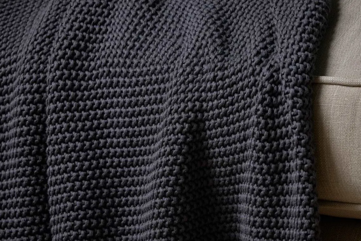 This tactile knitted throw is made from natural yarn-dyed cotton using a loose stitch known as a ‘moss stitch’. Soft, thick and cosy, it’s perfect for snuggling up. The classic charcoal colour is elegantly neutral, subtly adding texture and comfort to any interior when layered over a favourite armchair, sofa or bed. Available in four colours.