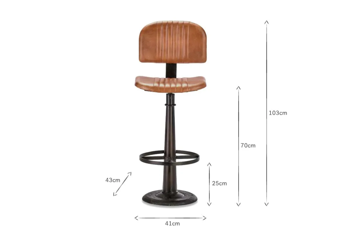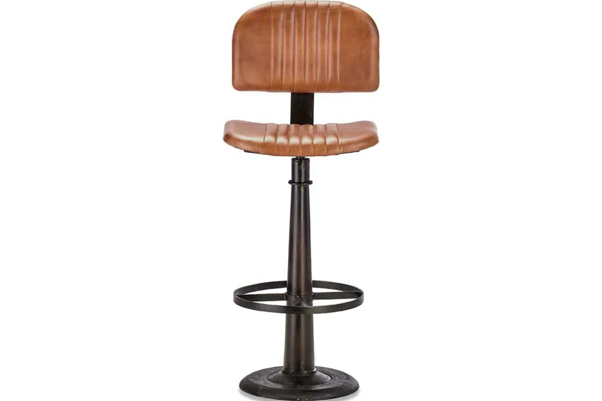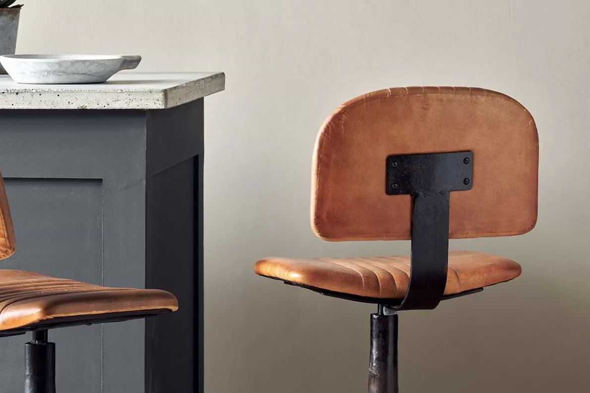 Stylish leather and sturdy iron combine to form our Narwana bar chair. The warm tones of the goat leather are created with natural dyes, the seats are padded for comfort and each piece includes a subtle stitching detail as well as a practical iron footrest.