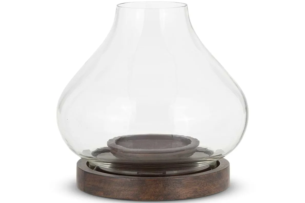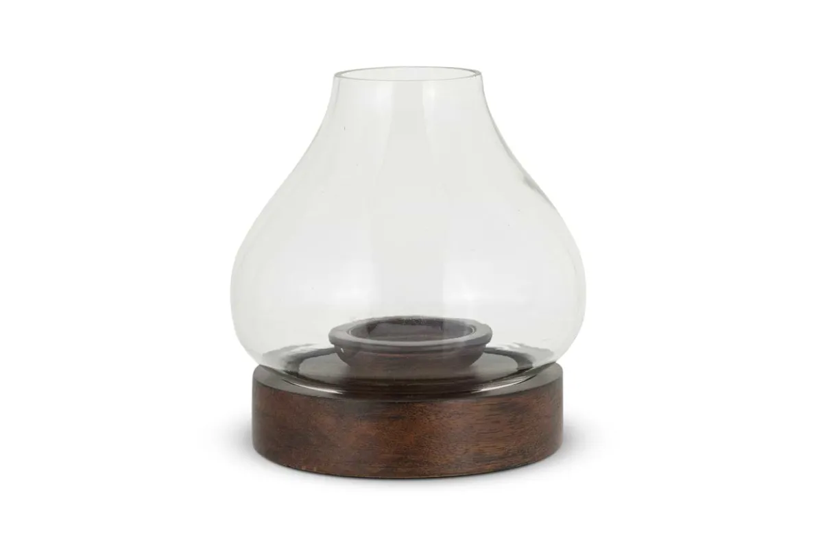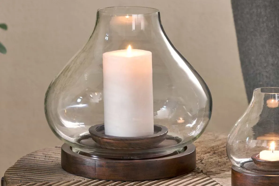 Perfect for atmospheric evenings, our stylish Naryla lantern has an elegant neck that slopes into a generous organic form and sits perfectly in its solid mango wood base. The contrasting glass and wood design creates a wonderfully tactile piece that brings understated style to a living space. Display on a sideboard or as a centre piece to a table and style with our rustic pillar candles.
