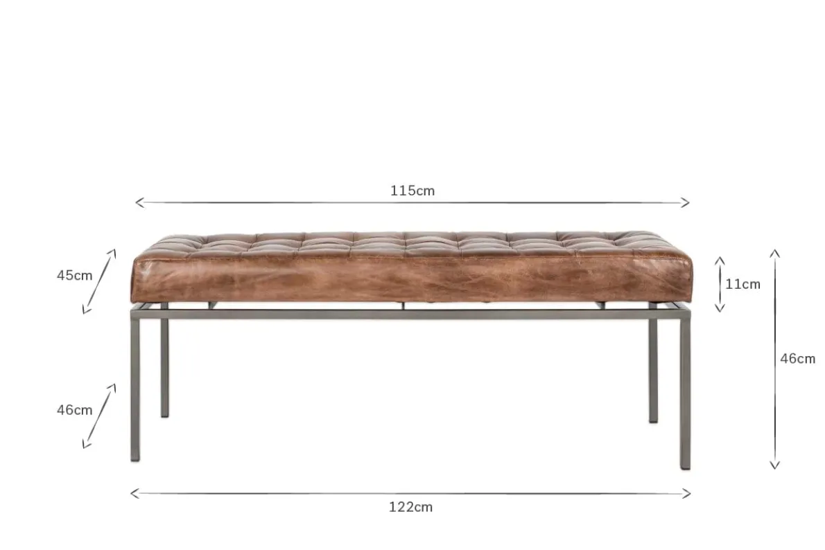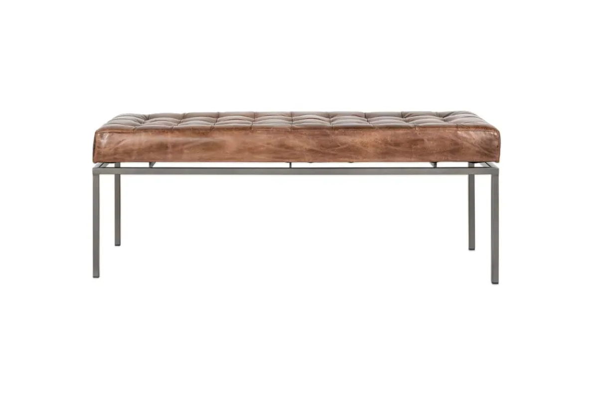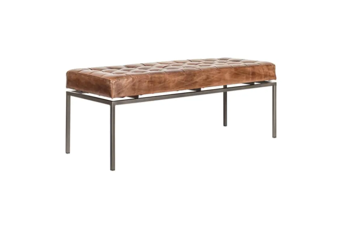Generously upholstered in tan leather with button tuck details on a simple, solid iron frame, the Nasan bench is a timeless, versatile design that would look equally at home in a hallway, end of bed or office.