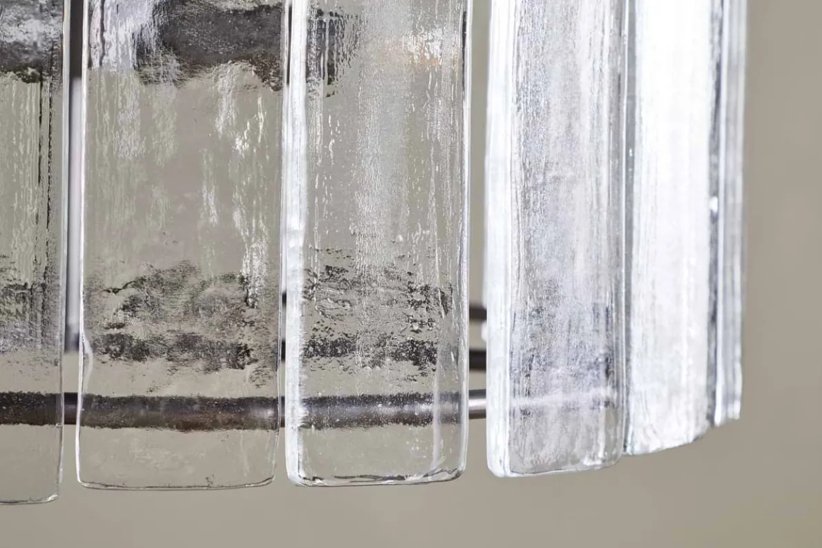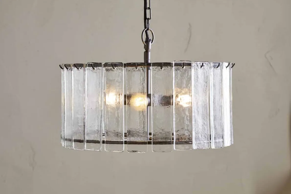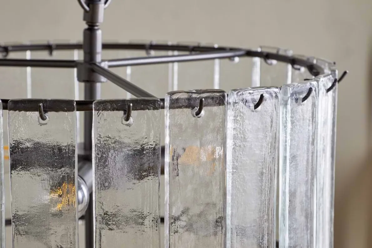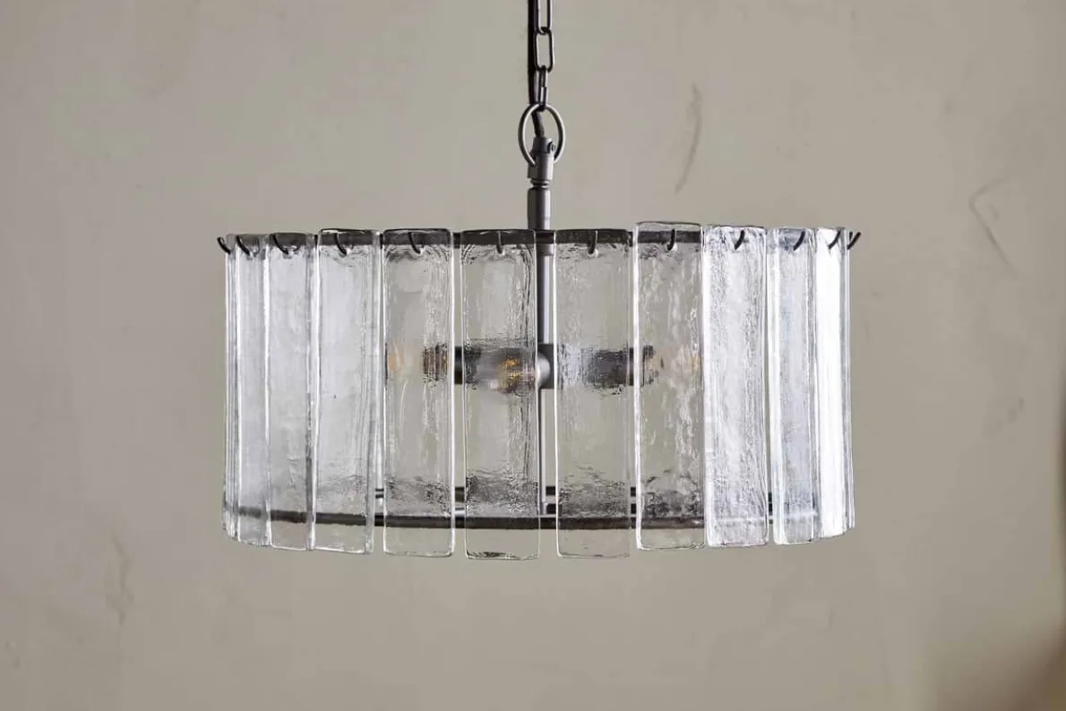 Our Nauka chandelier is an elegant and striking statement piece. The recycled glass delicately diffuses light, adding a soft textured ambience to any room. Complete with brass details, this chandelier is a stunning finishing touch for a hallway, dining area, or even a lofty living room ceiling.