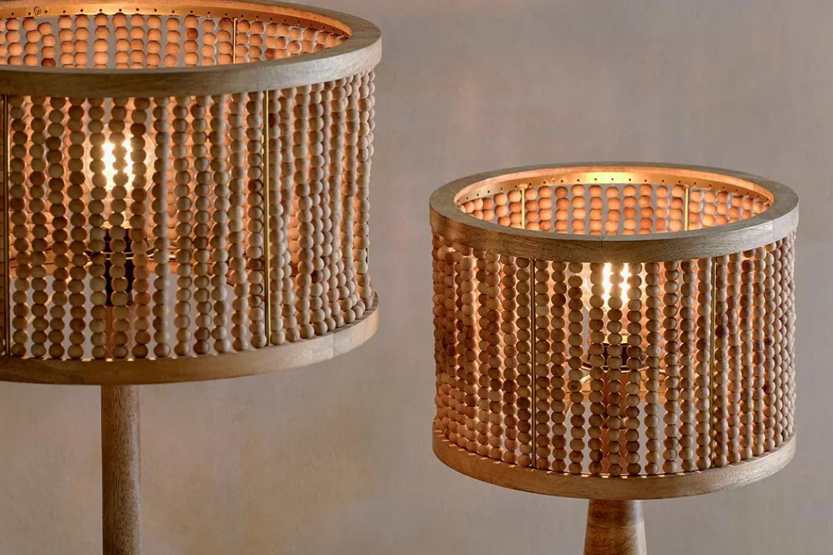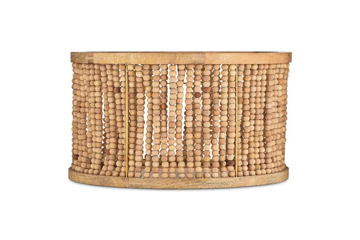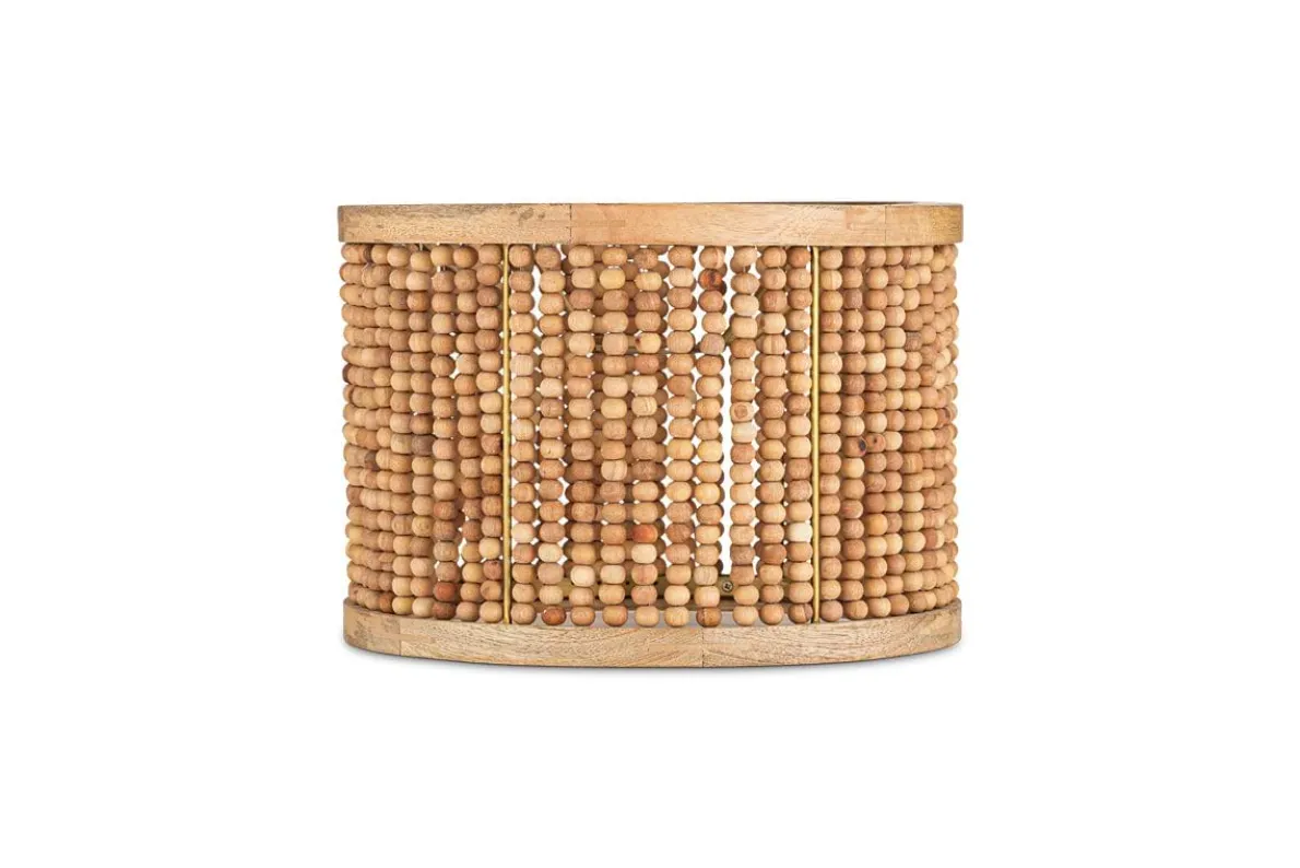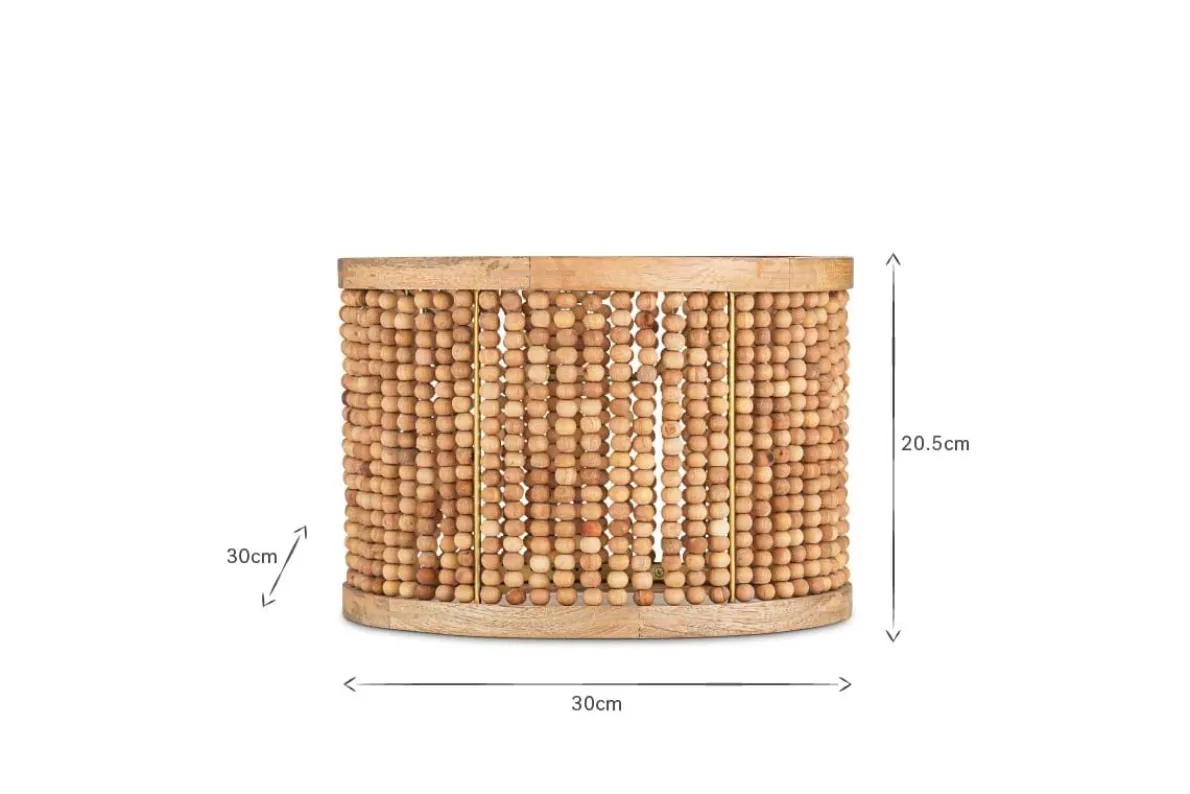 Our Neela lampshade creates a striking natural statement. This beautifully crafted design brings a laid-back, effortless warmth to any living space. It works just as well in a hallway as it does in a bedroom, dining or sitting room. Each wooden bead has been hand-carved and threaded onto strings that are set within a mango wood frame. To avoid waste, we use wood of different colours and textures that bring warmth and added interest to each piece. The antique brass support struts and double light fitting elevate the final look for an utterly unique piece that has been designed to stand out.