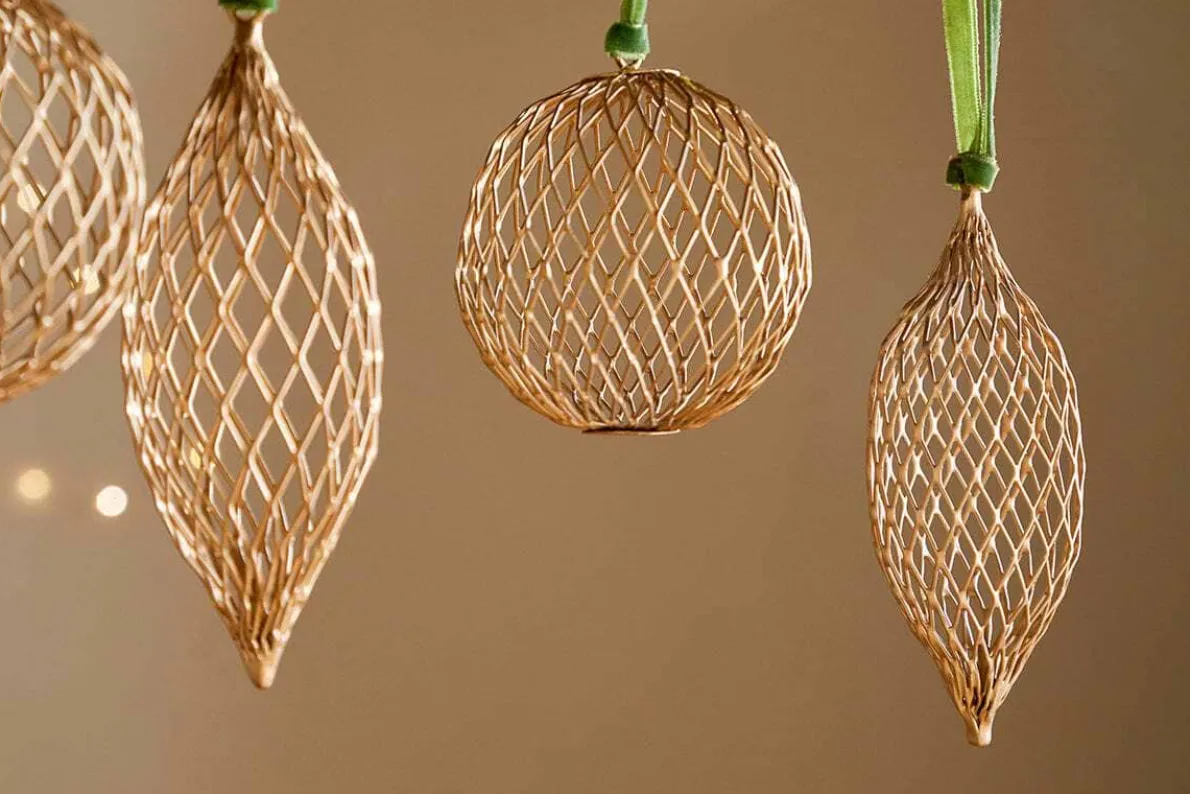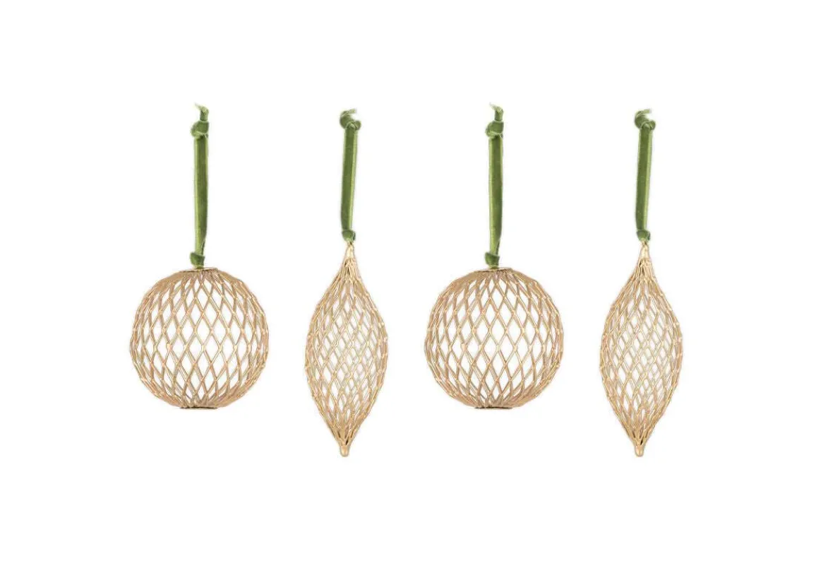 Hand-sculpted from wire in a striking organic shape, our Nirav wire baubles have a linked design which is beautifully complemented by an attractive brass finish. This unique combination of soft curves and industrial elements, style and texture, adds character to any space.-These baubles are adorned with green velvet ties to add a hint of Christmas colour to a delicate, simple design.