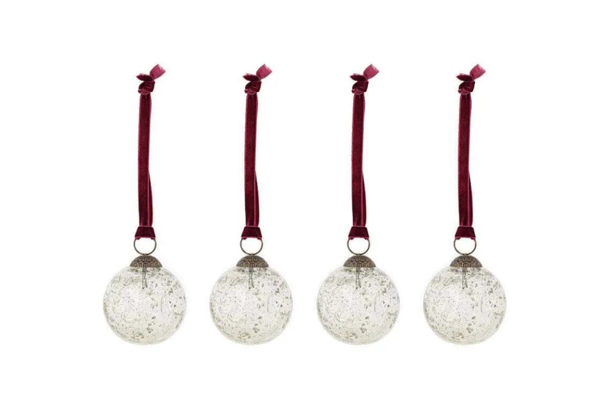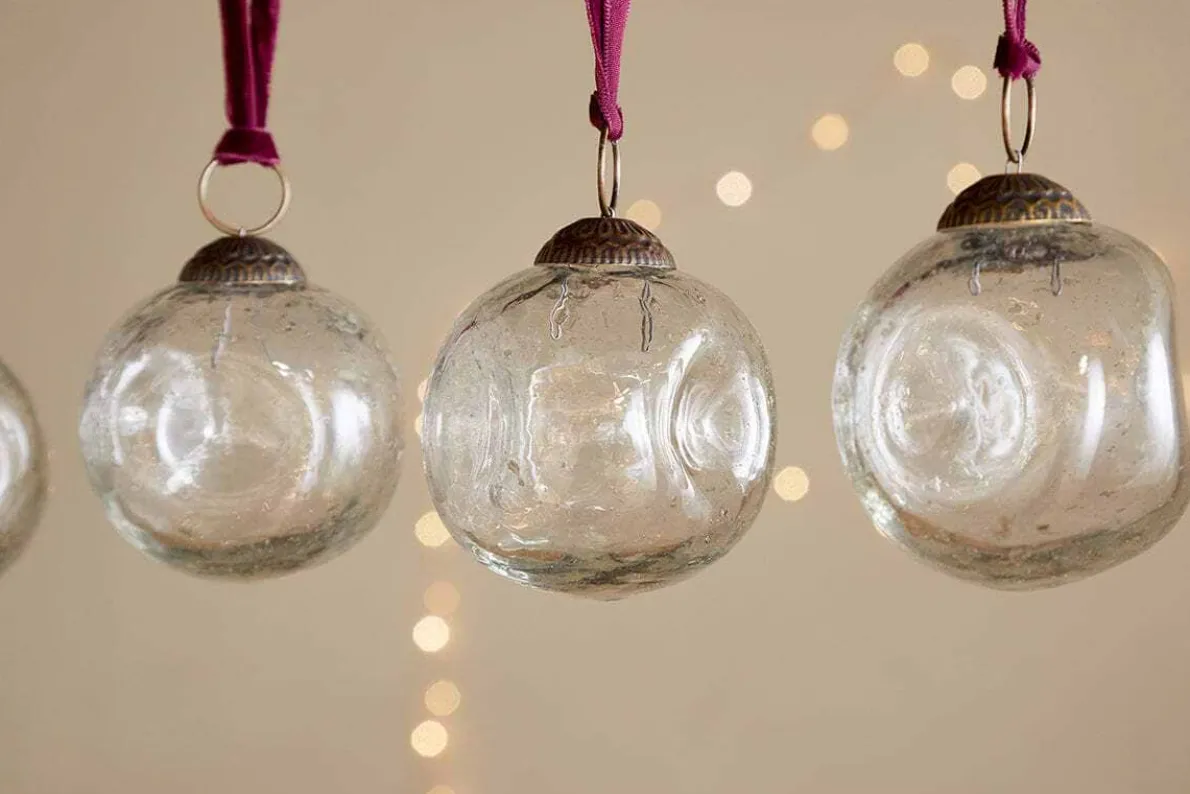With their softly pinched shape and deep burgundy velvet ties, these Nishan baubles bring a unique, decorative touch to festive displays. Made from recycled glass, their gently irregular form catches the light beautifully, adding depth and character to trees, wreaths, or table settings.