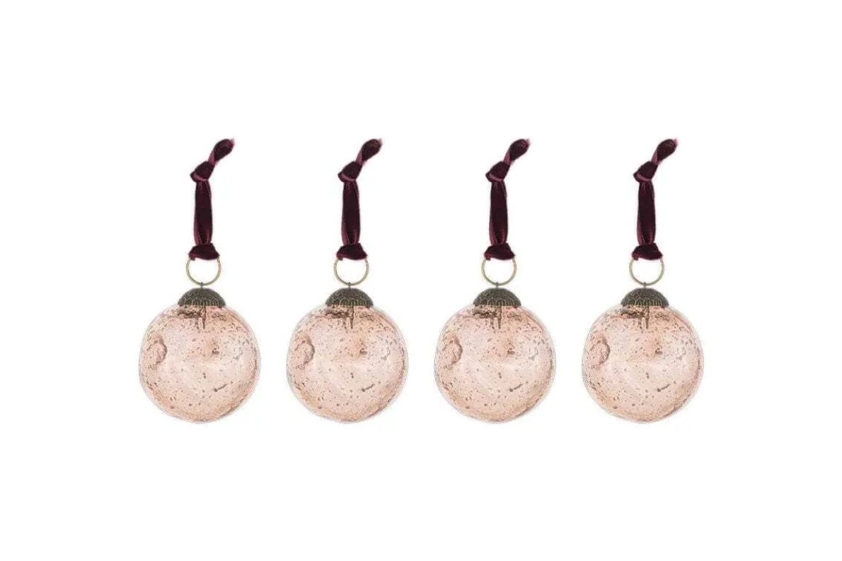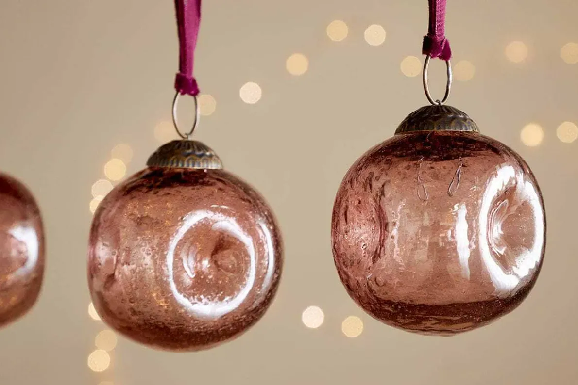 With their softly pinched shape and deep burgundy velvet ties, these Nishan baubles bring a unique, decorative touch to festive displays. Made from recycled glass, their gently irregular form catches the light beautifully, adding depth and character to trees, wreaths, or table settings.
