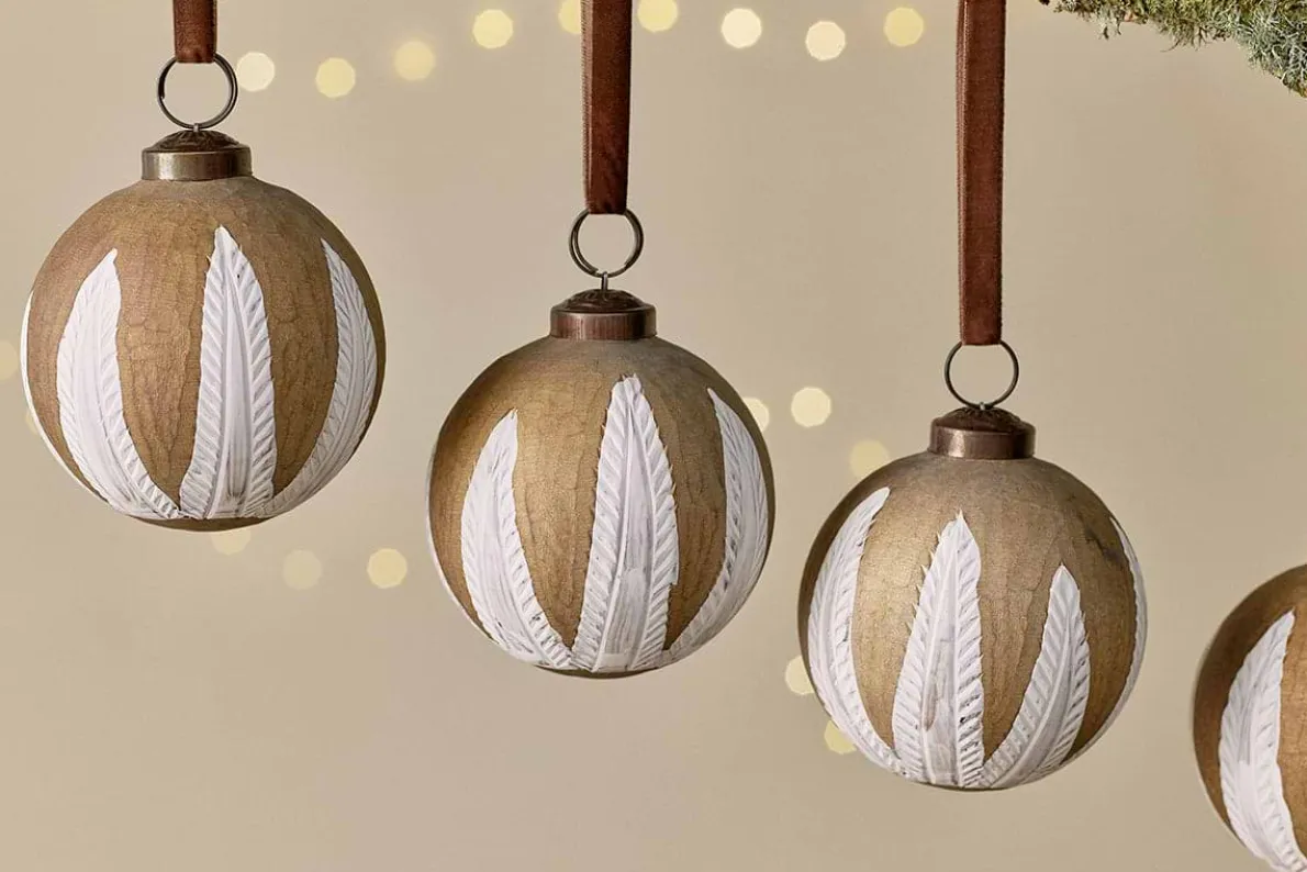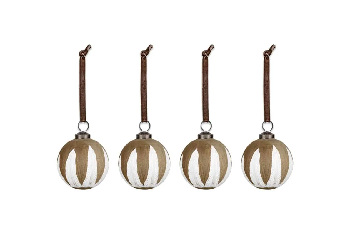 These set of 4 hand-painted Nori Baubles in gold and cream are mouth blown from recycled glass for a delicate decoration that takes inspiration from the natural world. The ethereal feather design and neutral colour palette sits beautifully among other festive decorations that use natural materials and organic shapes. Equally beautiful hung on a bare branch or on a luxuriantly foliaged tree. Finished with an antique-style clasp and elegant velvet ribbon.