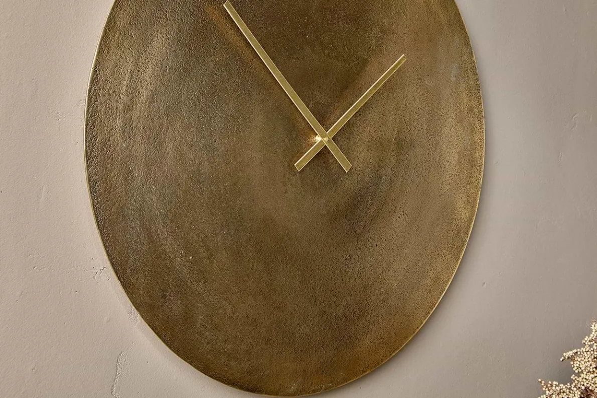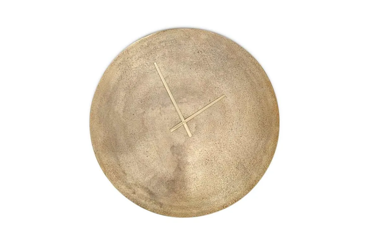 Keep time with our stylish Okota wall clock that adds an instant touch of understated glamour to any room. The antique brass finish on the face and metal handles create a simple abstract look that doubles up as a luxurious piece of wall art that would look equally at home in a minimalist, neutral setting or on a richly coloured wall hung among other found objects.