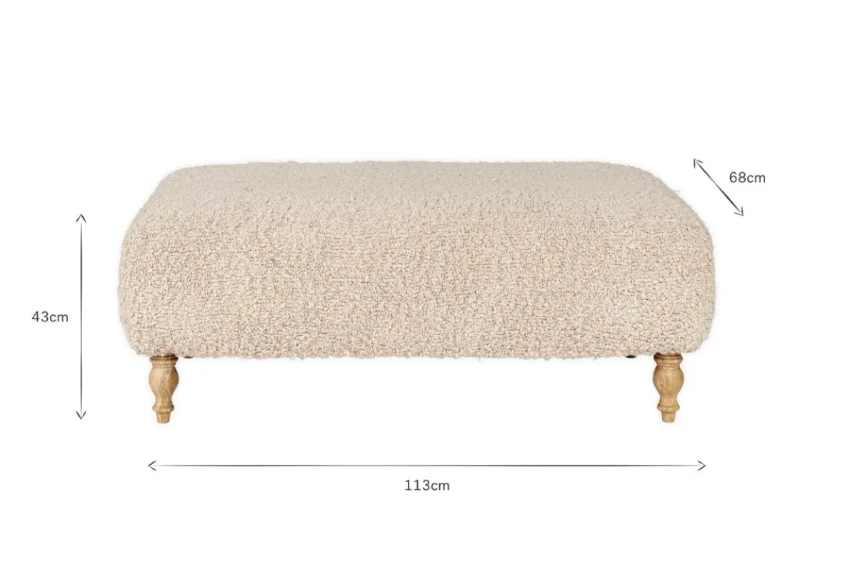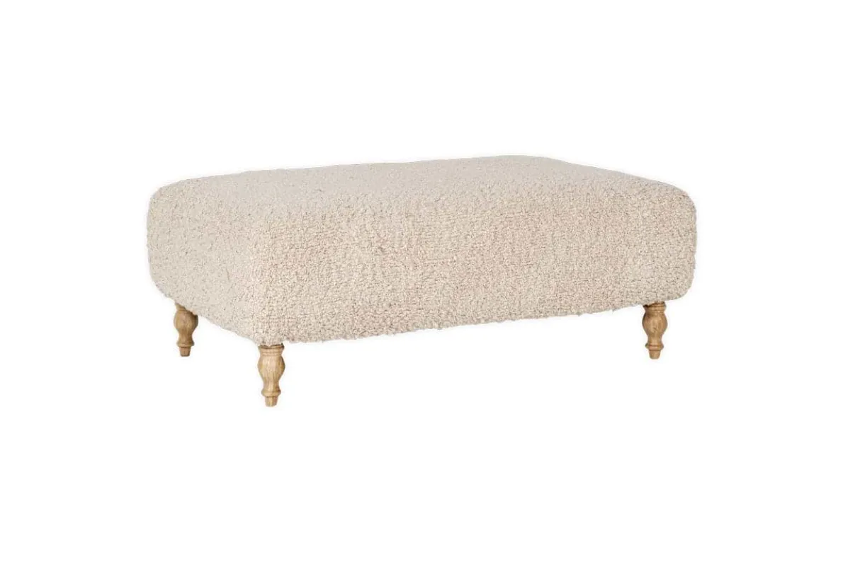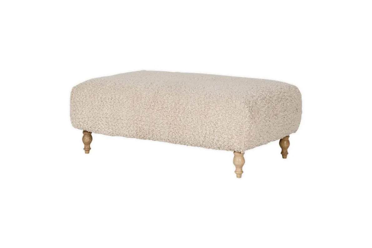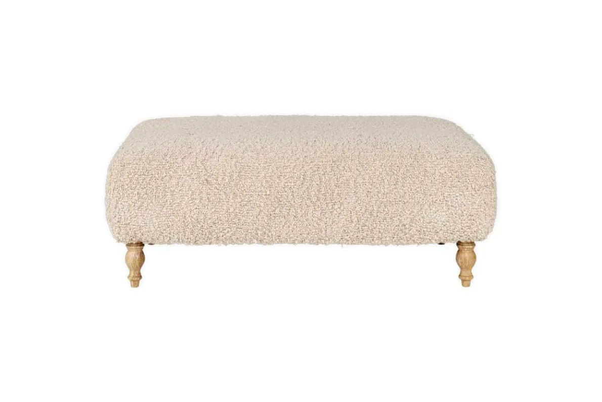 We’ve created the generously sized off-white Otas Ottoman, which makes a gorgeous standalone piece or can also be paired with our sumptuous Otas armchair. A handsome focal point in any living space, its decadent boucle style is eye-catching yet its neutral palette allows it to fit seamlessly into any design scheme. Made with beautiful cotton yarn, it has an irresistibly soft tactility that makes it a fabulous additional seating option as well as an irresistible footrest. This classically-shaped yet contemporary-looking piece has a solid mango wood base with carved feet that bring an extra touch of considered detail to this unique design.