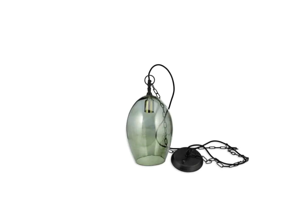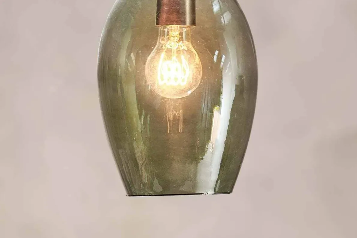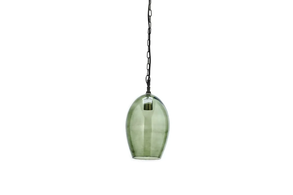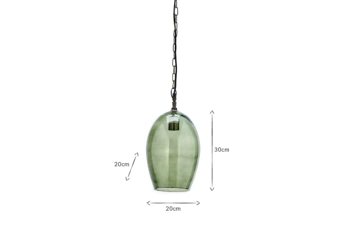 This small oval Otoro pendant light has a beautifully crafted handmade feel. The organic shape of the recycled glass dome as an elegant oval shape. The green smoke hues add to the look, and gently diffuse the light. The small size of the pendant means it would work well in a three above a table or kitchen island. Equally it is well suited as a bedside light, hung either side of a bed.
