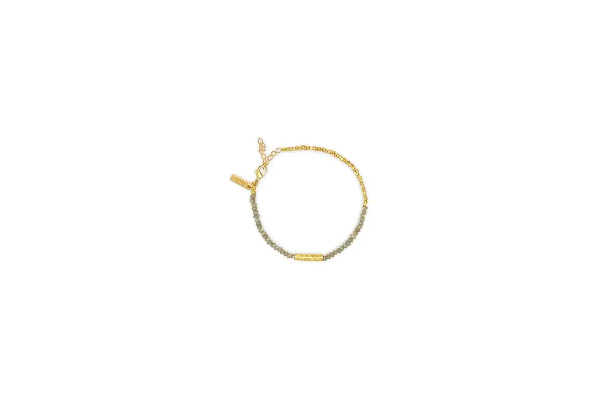 This elegant bracelet pairs shimmering labradorite with warm gold-coloured brass beads for a refined, light-catching finish. The combination of natural stone and metallic accents makes it easy to style with both casual and elevated looks. Presented in a linen pouch, it-s a versatile piece you-ll reach for again and again.