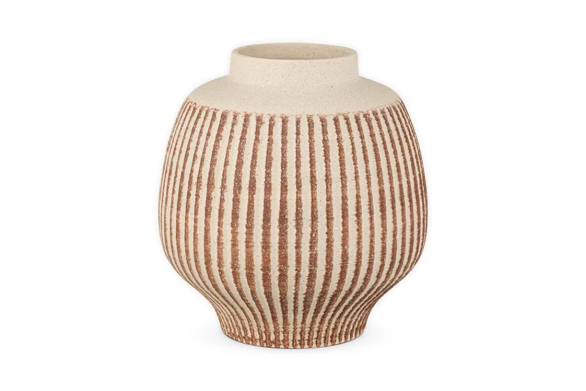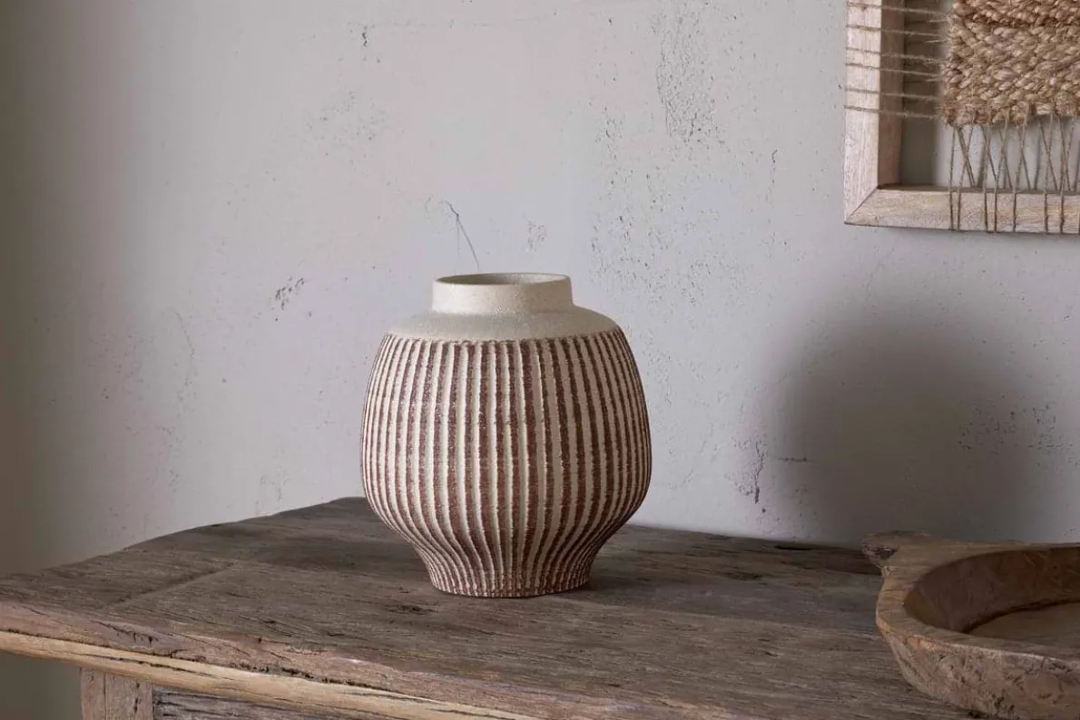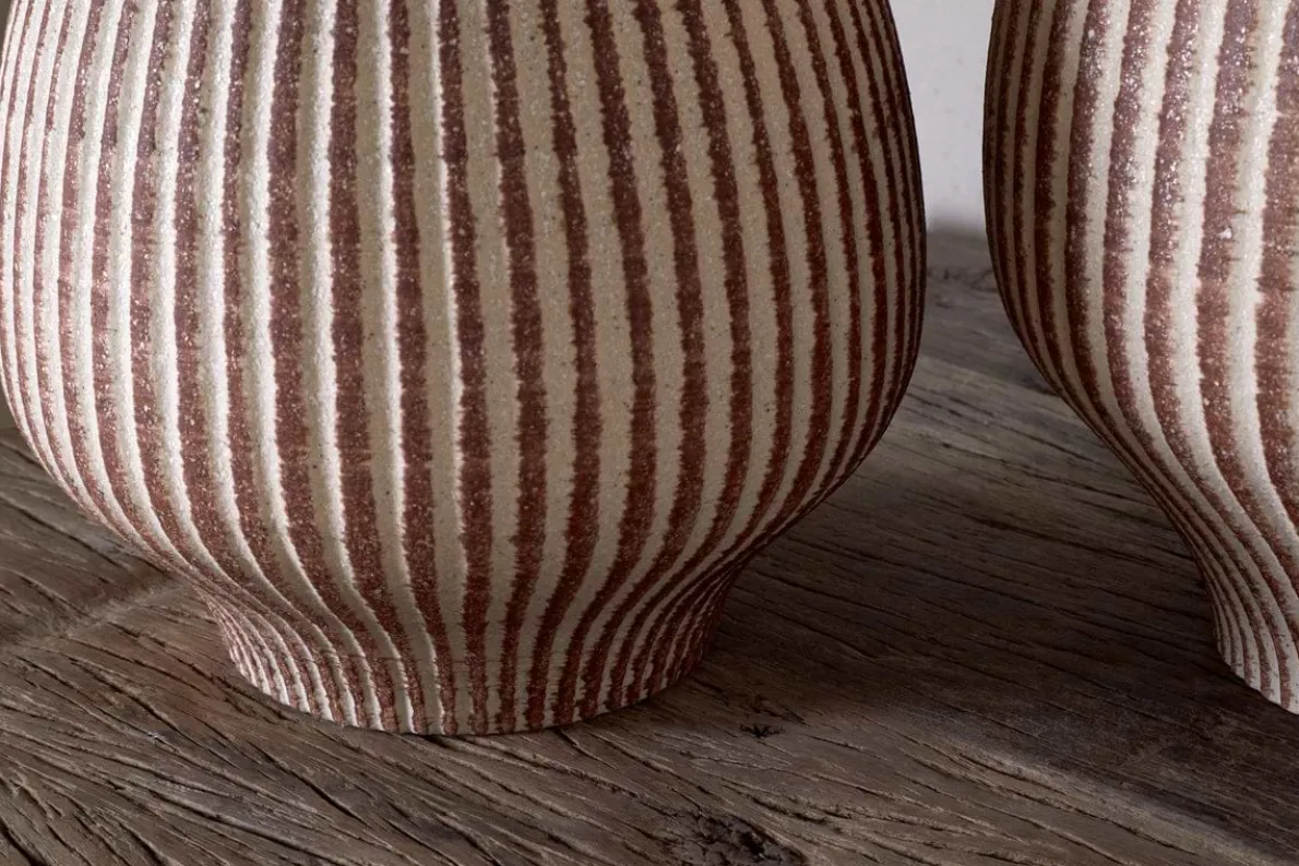 This vase features a parallel line design in two soft, natural tones, making it effortlessly easy to style across a range of interior schemes. Finished with a reactive glaze, each piece develops a subtly textured surface as it reacts in the kiln, ensuring no two are exactly alike. A beautifully balanced combination of form, texture, and understated colour.