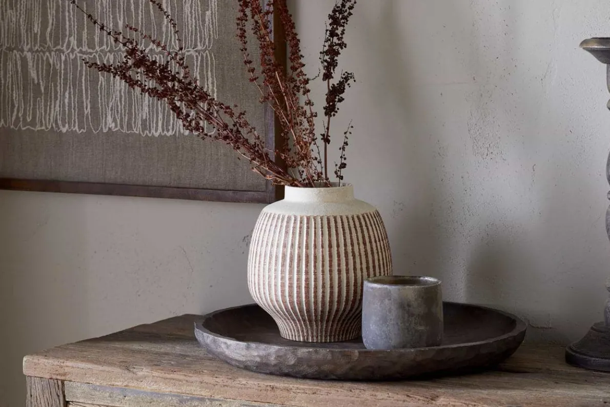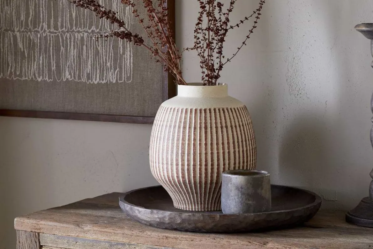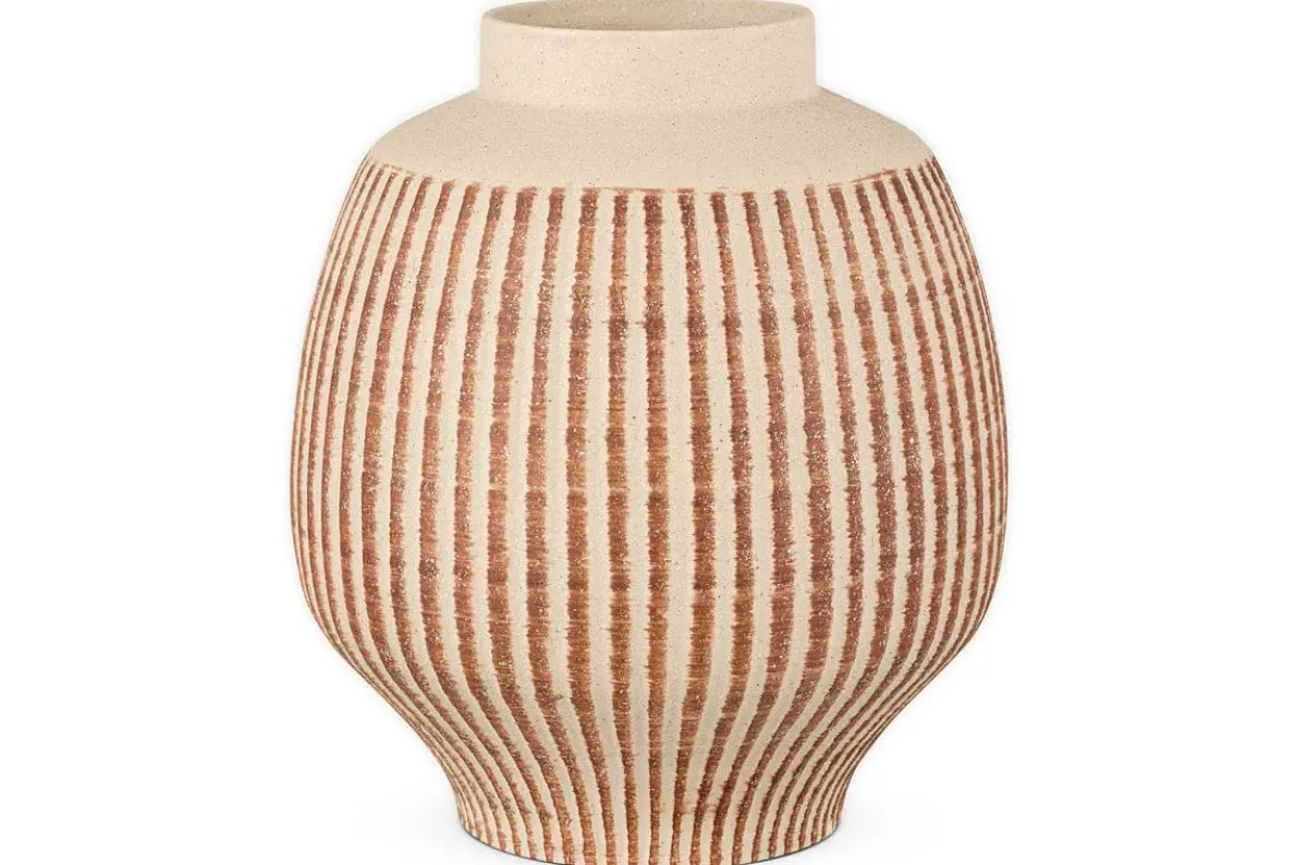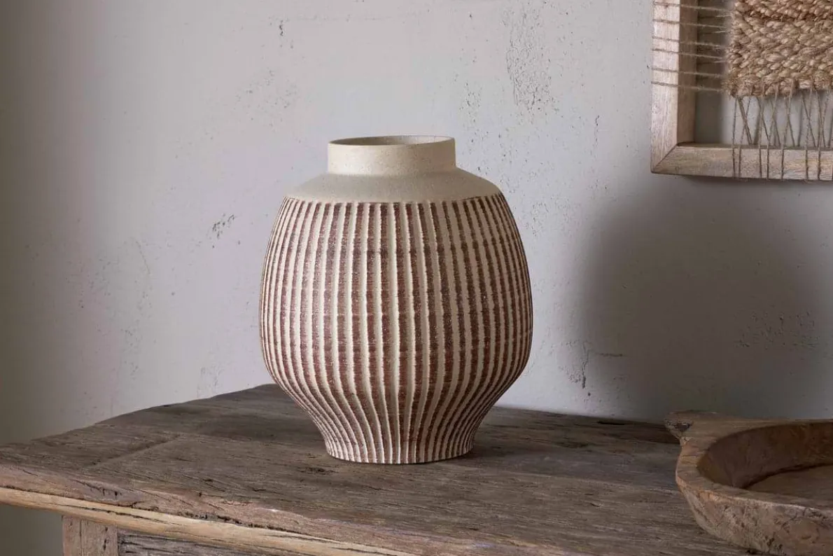 This vase features a parallel line design in two soft, natural tones, making it effortlessly easy to style across a range of interior schemes. Finished with a reactive glaze, each piece develops a subtly textured surface as it reacts in the kiln, ensuring no two are exactly alike. A beautifully balanced combination of form, texture, and understated colour.