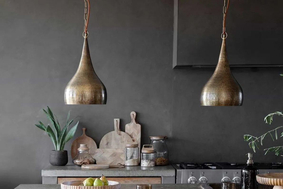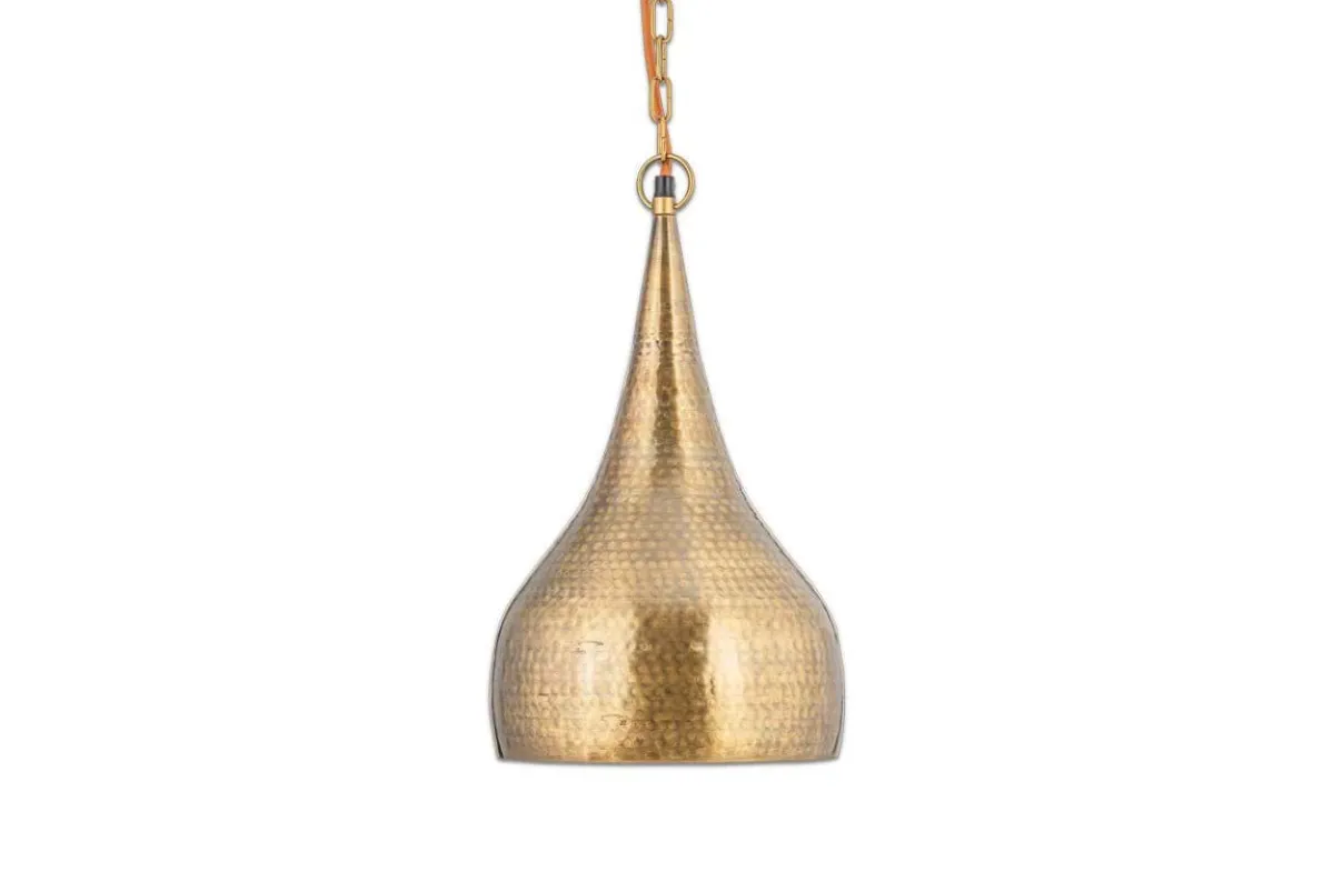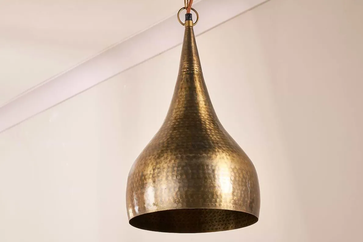 The curvaceous shape of the Quinn pendant light is complimented by its antique brass finish. The metal is skillfully hammered using hand tools, creating an interesting texture. The rich, antique brass finish and textured pattern give the Quinn pendant an antique feel. This smaller pendant light sits well above a dining table or kitchen island. The texture reflects beautifully on the brass finish exterior, showcasing the best of the handmade touches. The wide base of the light releases a generous flow of light. Each pendant has a rust coloured fabric cable and antique brass ceiling rose.