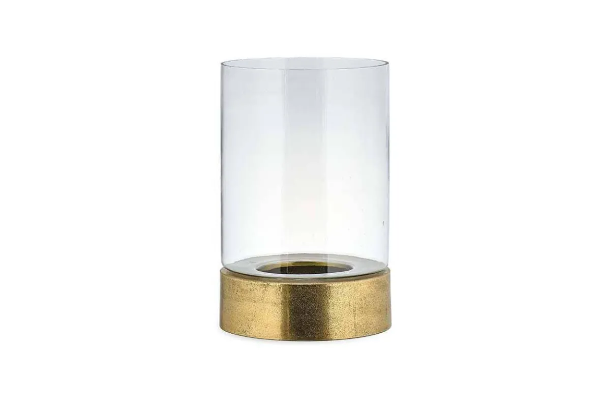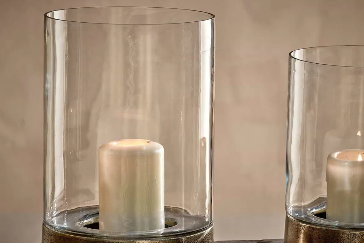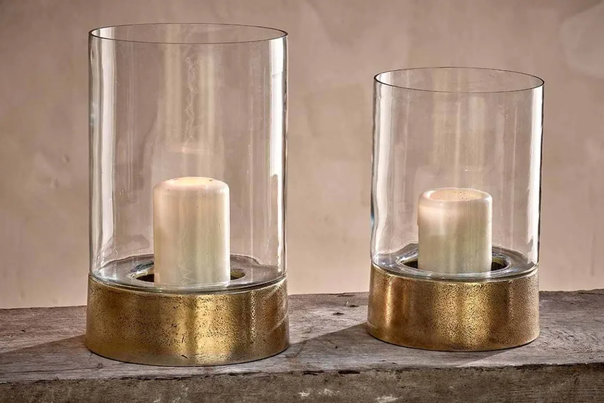 The Rajura hurricane lanterns combine a simple glass design with a deep brass-coloured base. The warm golden hues of brass add a touch of sophistication whilst maintaining a rustic quality with the base cast from aluminium to create an imperfect and interesting texture. Hurricane lanterns are perfect indoors and out; scatter a variety of sizes in your space to create a soft ambient mood. Complete the look with a church pillar candle.