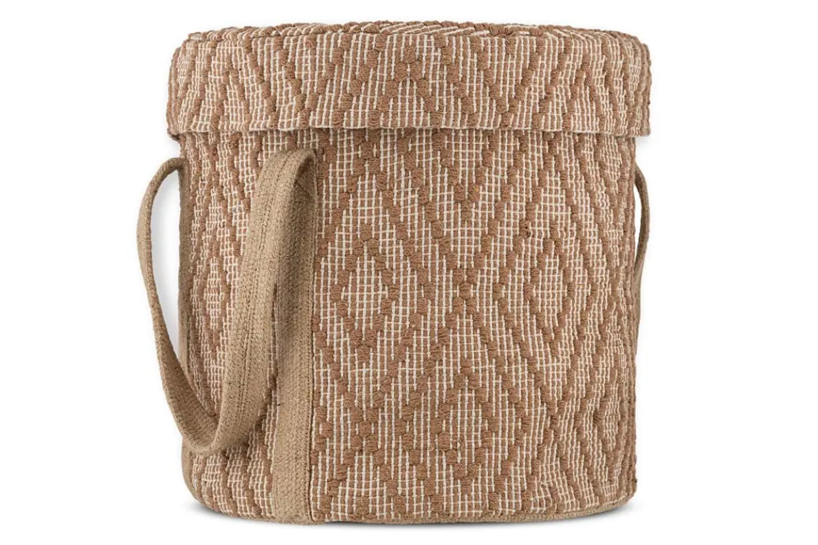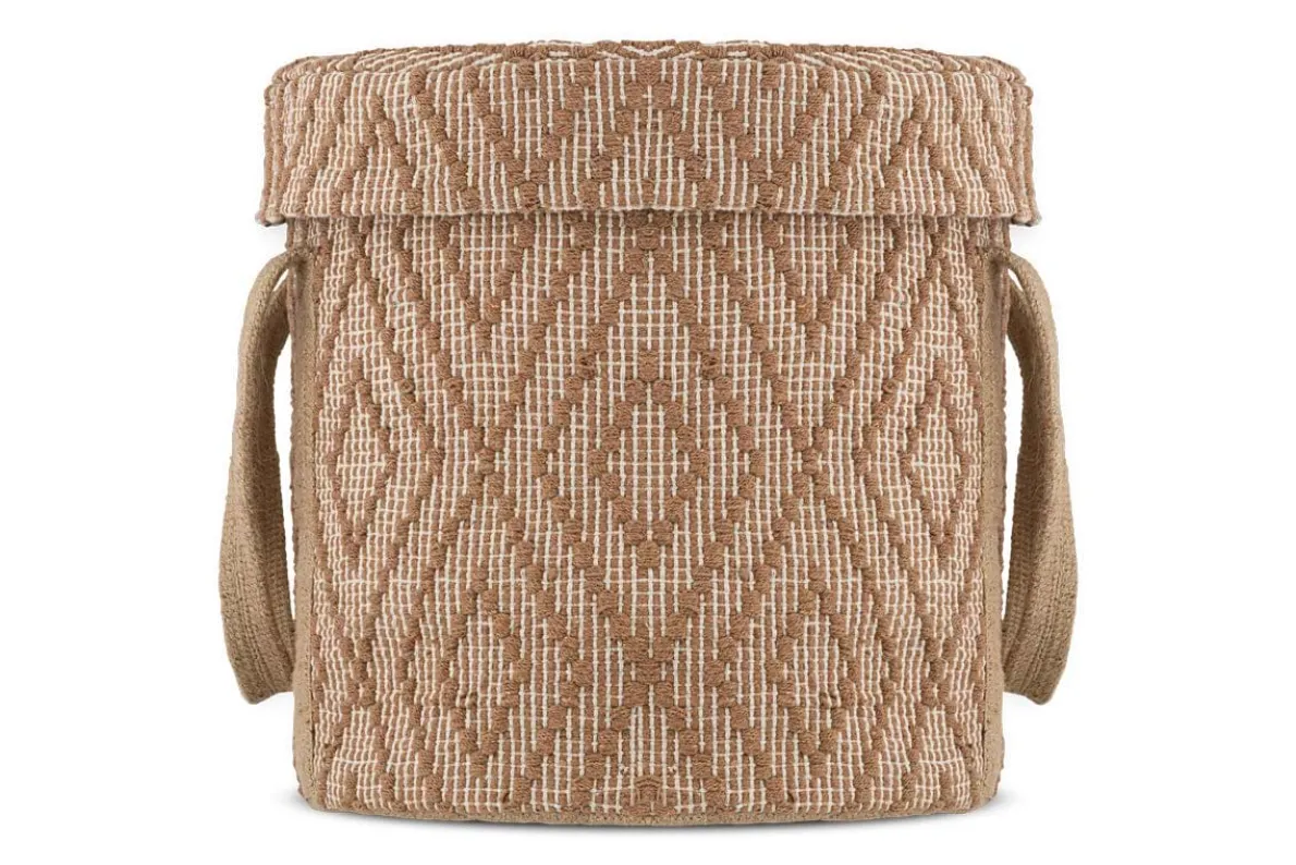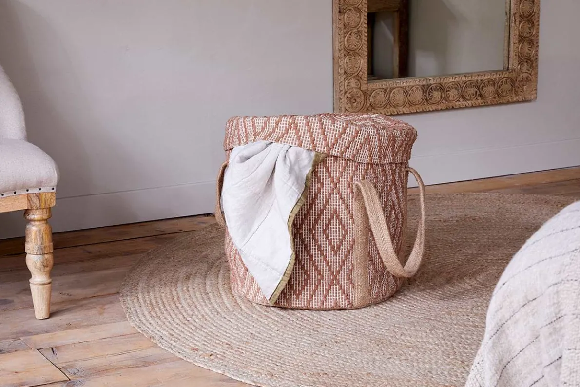 Versatile and functional, this beautifully woven basket has a traditional kilim design depicted in warm tones of rust and natural jute to bring a touch of muted colour to a bedroom, landing or bathroom scheme. With handles for ease of carrying and a soft cotton lining, this basket comes with a lid to keep items discreetly out of sight. Also ideal for storing towels or blankets, it is the perfect blend of utility and aesthetic appeal.
