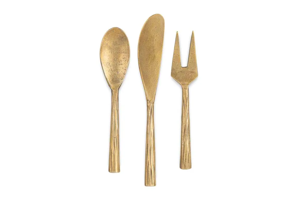 This set of serving cutlery features an antique brass finish that adds warmth and depth to your table. The handles are detailed with a delicate etched design, while the gently textured surface lends a tactile, time-worn character. Perfectly suited for serving cheese, charcuterie or shared dishes, they bring both function and quiet elegance to relaxed gatherings.