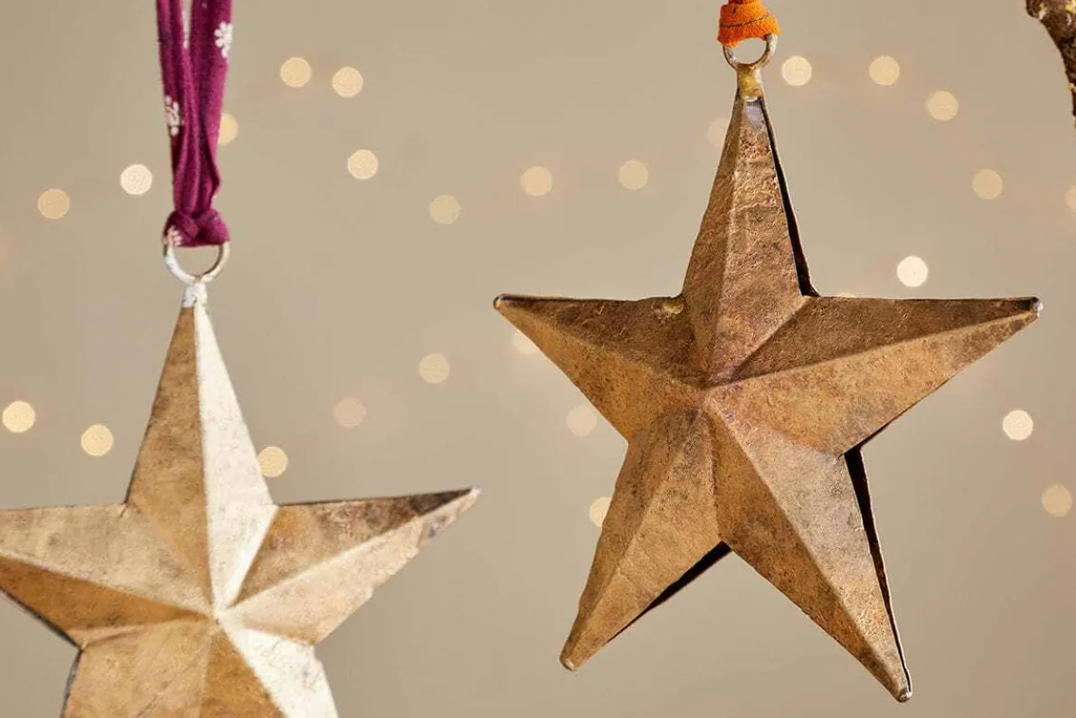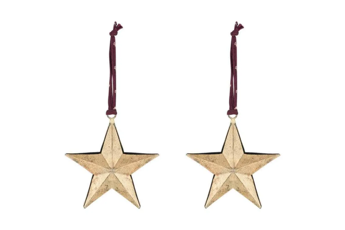This iron bauble features a striking star silhouette with an antique brass finish, bringing warmth and character to any festive display. Its slim profile makes it ideal for hanging on branches or incorporating into decorative arrangements. Finished with vibrant sari ties, it adds a touch of colour and texture to seasonal styling.
