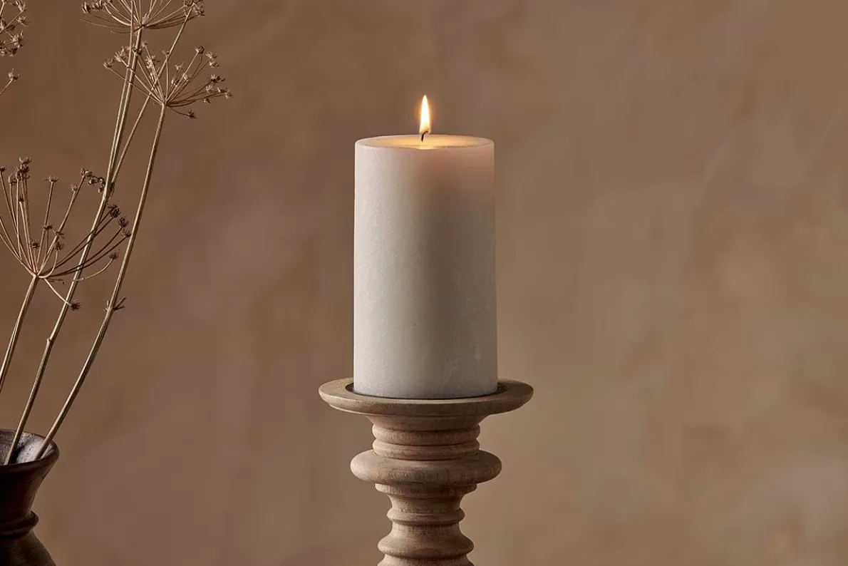 Our Rustic pillar candle has a textured finish for a relaxed take on a classic shape. These were designed specifically for our candle holders proportioned to hold a larger candle, they look beautiful on a sideboard or mantelpiece in a living room or hallway or as the centrepiece of a table setting for a warm and welcoming scene. Made from a soy wax blend and available in a choice of three colours: calm neutral, rich charcoal or warm olive; and two sizes: Large (18cm x 10cm) and Small (15cm x 8cm). Candleholder is not included.