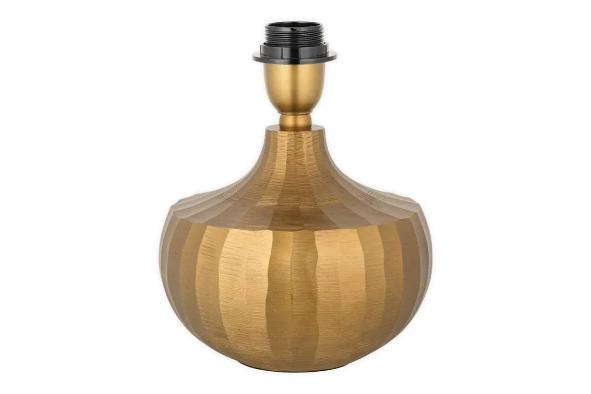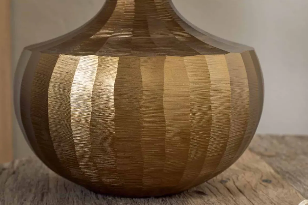 This lamp features a sculptural, organic form with a softly textured surface created through a traditional cast metal process. The grooves add depth and character, enhancing its tactile appeal. The base is finished in antique brass, offering a warm, subtle reflection of the light above. A striking piece that brings both texture and atmosphere to any setting.