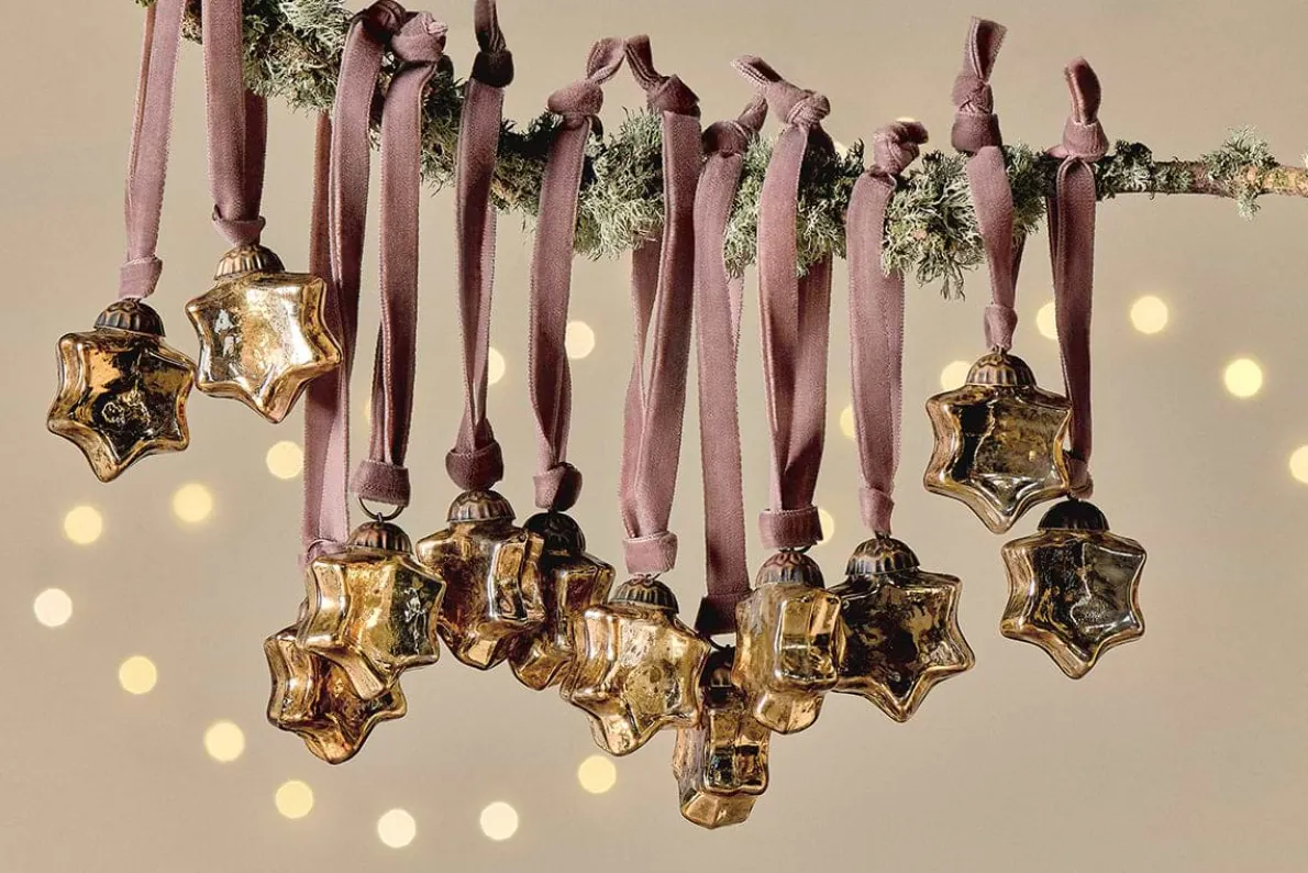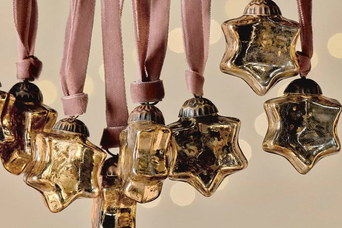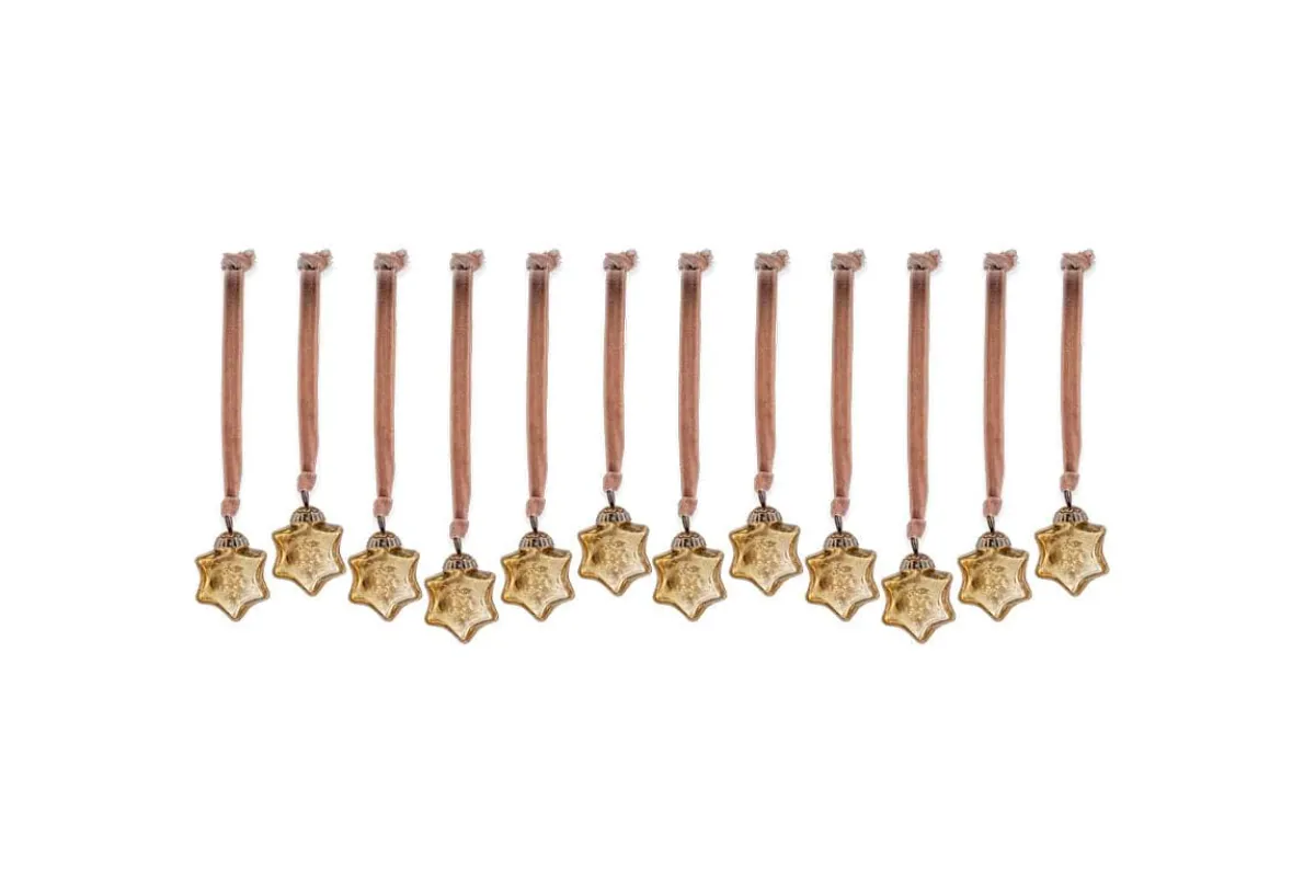 These delicate Sardi Star Baubles bring a delightful twinkle to Yuletide revelries. Hang liberally on a bare branch or in clusters twinkling among foliage, these organically shaped baubles are much loved and are fabulous teamed up with our larger Set of 4 Sardi Stars for harmonious form and contrasting scale. sumptuously decked-out tree or bare branch display. Finished with an antique-style clasp and elegant velvet ribbon. Available in clear or antique gold.